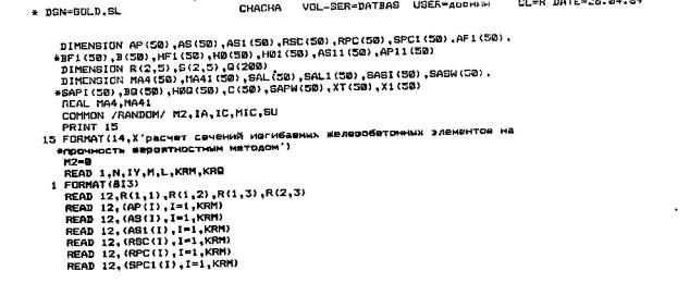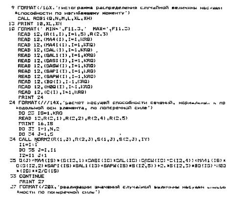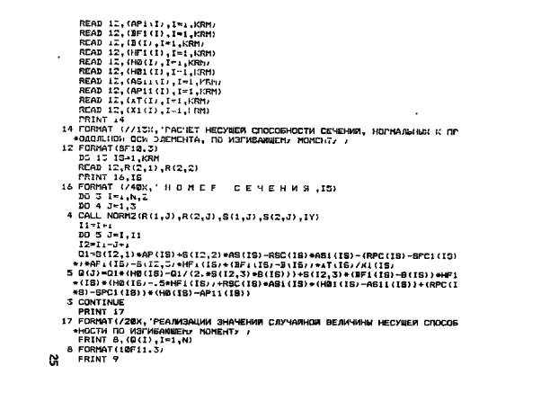 отклонение Последующие перфокарты (или группы перфокарт) содержат для различных сечений значения параметров: 20-я - 21-я - 22-я - 23-я - 24-я - 25-я - Количество параметров, содержащихся в 19-30-й перфокартах, соответствует количеству сечений, в которых определяется несущая способность по поперечной силе. Приложение 2Программа расчета сечений изгибаемых железобетонных элементов на прочность методом статистических испытаний (методом Монте-Карло)