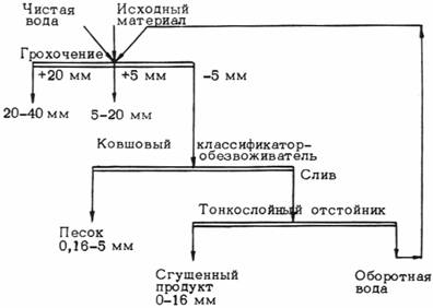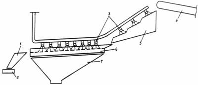 Рис. 1. Технологическая схема "мокрого" способа обогащения отсевов дробления. 2.2.3. Для промывки исходных отсевов дробления, выделения из них частиц крупнее 5 мм и пульпообразования следует использовать, как правило, виброгрохоты типа ГИЛ или ГИС. Размер грохота зависит от производительности установки по обогащению и определяется расчетом (прил. 1). Виброгрохот оборудуется специальным приемным лотком длиной не менее 1 м, имеющим дно вогнутой или уступообразной формы (рис. 2). Над приемным лотком и ситом виброгрохота для подачи воды устанавливают трубы с форсунками или поперечными щелевыми прорезями. Давление воды в трубах поддерживают не менее 0,2 МПа. Для сбора материала (пульпы), прошедшего нижнее сито, устанавливают пульпосборник в воде пирамидального бункера.