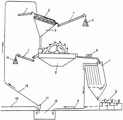 Рис. 7. Технологическая схема сухого обогащения влажных отсевов дробления 2.3.3. Подсушивание отсевов дробления производят, если их влажность превышает 1,5-3,0 %. Допустимая максимальная влажность определяется зерновым и минералогическим составами отсевов дробления, а также оборудованием, применяемым для удаления пылевато-глинистых частиц, и устанавливается на стадии технологического опробования. Для “сухого” обогащения на дробильно-сортировочные заводы следует направлять отсевы после второй (и последующих) стадий дробления. 2.3.4. При пневматической классификации мелкозернистых материалов используют прямоточную систему аспирации ВНИИнеруда, по которой снижение объема выброса воздуха может быть достигнуто за счет сброса только части объема обработанного воздуха в атмосферу (полузамкнутая система), а для компенсации сброса производится подсос из атмосферы (рис. 8). Для выравнивания давления в системе и дополнительной очистки запыленного воздуха, поступающего в пневмоклассификатор, на запорном участке устанавливается пыле концентратор. Расход воздуха в системе регулируется с помощью специальных шиберов.