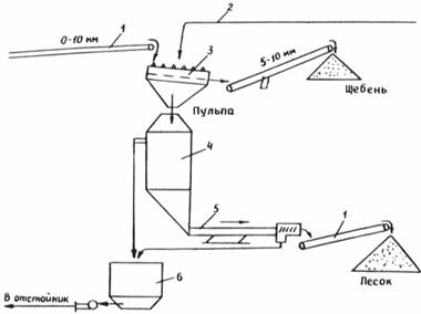 Рис 4 Схема установки ВНИПИИстромсырье для промывки песка: 1 - конвейер; 2 - подача воды; 3 - грохот; 4 - грунтосборник; 5 - виброзатвор-обезвоживатель; 6 - зумпф