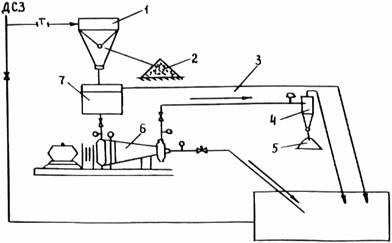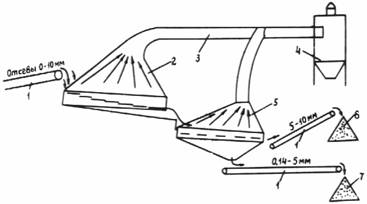 Рис. 5. Схема установки ВНИПИИстромсырье для обогащения отсевов: 1 - конический гидрогрохот; 2 - склад щебня: 3 - трубопровод; 4 - гидроциклон; 5 - склад обогащенного песка из отсевов; 6 - гидроциклонная насосная установка; 7 - зумпф