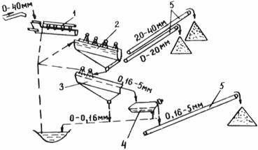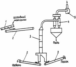Рис. 8. Схема полузамкнутой системы обеспыливания при пневматической классификации: 1 - пневмоклассификатор; 2 - циклоны; 3 - вентиляторы; 4 - пыле концентратор; 5 - воздуховод 2.3.5. Воздух, используемый для “сухого” обогащения отсевов дробления, в процессе работы загрязняется пылевато-глинистыми частицами. Предельно допустимая концентрация (ПДК) загрязняющих примесей в воздухе определяется конкретно для каждой установки. 2.3.6. При необходимости подсушивания отсевов дробления целесообразно использовать сушильные барабаны, снабженные пылеулавливателями (прил. 12). 2.3.7. Для выделения из отсевов дробления материала крупнее 5 мм и удаления из них пылевато-глинистых частиц следует применять виброочиститель песчаных материалов на базе виброгрохота типа ГИС или ГИЛ, оснащенный дополнительным оборудованием для механической диспергации загрязняющих примесей и их отделения от минеральных частиц отсевов дробления. Схема получения щебня и песка дробленого из отсевов с применением виброочистителя приведена на рис. 9, а характеристика виброочистителя с дополнительным оборудованием - в прил. 13. Для "сухого” обогащения отсевов дробления следует применять установки, в состав которых входят пневмоклассификаторы вертикального типа (прил. 14). Необходимый объем очищенного воздуха, применяемый при обогащении отсевов дробления, рассчитывается по соответствующим методикам. Для очистки воздухе, выбрасываемого в атмосферу, следует применять двухступенчатую систему с циклонами (1-я ступень очистки) и рукавными фильтрами (вторая).