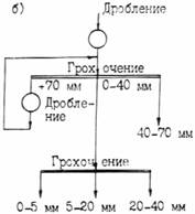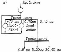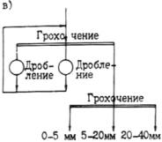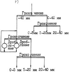 Рис. 10. Технологические схемы производства щебня с использованием ПДСУ большой производительности: а -из горной породы 1-й группы; б - из горном породы 2-й группы; в - из гравийно-песчаных пород с совместным выпуском щебня и гравия; г - то же, с раздельным 3.3.5. Горные породы 2-й группы характеризуются разной прочностью в одном и том же месторождении и содержанием большого количества загрязняющих примесей. Для них наиболее характерна технологическая схема (рис. 10, б), включающая дробилки ударного действия СМД-75А и СМД-86А. Последняя стадия дробления осуществляется в замкнутом цикле дробилки с грохотом. Предварительное грохочение производят при наличии в исходной горной массе комовой глины более 3 %. Готовый щебень промывают в корытных и вибрационных мойках. Отбор комовой глины из щебня и разделение щебня по прочности можно осуществлять на классификаторах ДБК-20. 3.3.6. Горные породы 3-й группы характеризуются значительными колебаниями зернового состава и загрязненностью горной массы. В зависимости от крупности валунов в горной массе дробление производят в агрегатах СМД-131А и СМД-133. Предварительное грохочение горной массы обязательно. Можно предусматривать возможность и совместного и раздельного выпуска щебня и гравия (рис. 10 ,в и 10 ,г). "Сухую" очистку следует осуществлять в сушильно-очистительных барабанах и виброгрохотах с отсосом. Обогащение щебня и гравия по прочности и выделение глины могут быть организованы на классификаторах ДБК-20. "Сухая" очистка осуществляется с помощью виброударных очистителей. 3.3.7. При обогащении щебня "мокрым" способом в зависимости от содержания в нем загрязняющих примесей и слабых разностей применяют вибрационные грохоты типа ГИС и ГИЛ, корытные мойки К-12, К-14, К-7, вибромойки СМД-88; при "сухом" способе - сушильно-очистительные барабаны, виброударные очистители, виброгрохоты с отсосом, барабанные механические классификаторы. При переработке каменных материалов в зимнее время, для предотвращения их смерзания, поверхностная влажность щебня, гравия и щебня из гравия, определяемая как разность между общей влажностью материала, и его влажностью в воздушно-сухом состоянии, не должна превышать дли материала фракций 5-10 мм - 0,35 %, 5-20 мм - 0,6 % и 10-20 мм - 0,8 %; влажность песка не должна превышать 1,5 % по массе. 3.3.8. При обогащении разнопрочных каменных материалов в зависимости от состава горной массы может быть предусмотрено разделение горной массы перед первой стадией дробления на два продукта - крупный и наиболее сухой, а также мелкий и наиболее влажный. Крупную часть горной массы сразу направляют на дальнейшую переработку и “сухую” очистку, а мелкую предварительно подсушивают. Такая схема производства позволяет значительно снизить объемы подсушиваемого материала при очистке каменных материалов от легко отделяемых загрязняющих примесей. В этом случае в качестве очистительного оборудования используют вибрационные грохоты с большей амплитудой колебания сит, оборудованные укрытиями с пылеотсосом. 3.3.9. При обогащении равнопрочных каменных материалов следует определять границу разделения горной массы по крупности, для чего перед направлением последней на переработку находят нижнюю границу ее крупности, при которой средняя влажность крупной фракции на 25 % выше влажности материала в воздушно-сухом состоянии. При