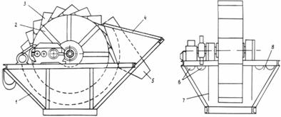 Схема ковшового классификатора-обезвоживателя: 1 - ванна; 2 - элеваторное кольцо; 3 - ковши; 4 - загрузочная воронка; 5 - течка; 6 - сливные пороги; 7 - перегородка; 8 - боковой отсек Приложение 4Расчет спиральных классификаторовПроизводительность спирального классификатора рассчитывают по сливу и песку. Производительность спирального классификатора по обезвоженному песку Qп (т/ч) определяют по формуле