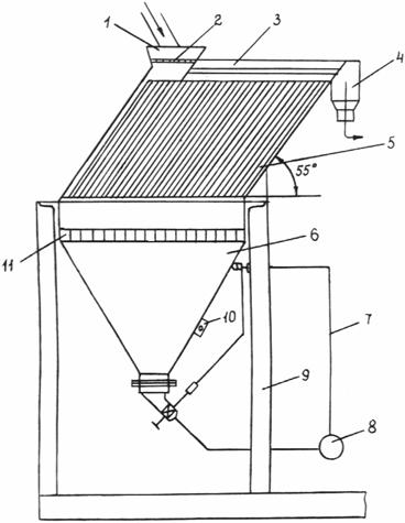 Схема тонкослойного отстойника: 1 - приемная воронка; 2 - решетка приемной воронки; 3 - камера осветления; 4 - патрубок для слива осветленной воды; 5 - пластины; 6 - бункер для сгущенного остатка; 7 - система автоматического контроля за уровнем осадка включением и выключением насоса; 8 - насос; 9 - рама; 10 - вибратор накладной; 11 - решетка бункера Приложение 7Расчет сгустительной воронкиПроизводительность сгустительной воронки по твердой части питания Qт (т/ч) и по сливу Qсл (т/ч) определяется по формулам:
