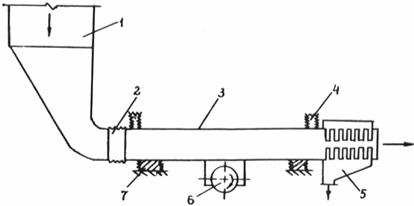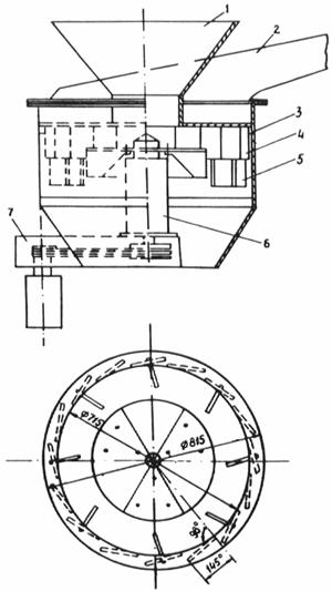 Рис. 2. Схема дезинтегрирующего устройства: 1 - загрузочная воронка; 2 - отсос; 3 - корпус; 4 - отражательные пластины; 5 - направляющие пластины; 6 - привод; 7 - электродвигатель