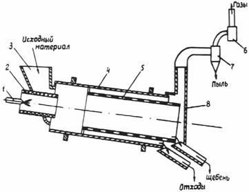 Принципиальная схема сушильно-очистительного барабана Союздорнии: 1 - форсунка, 2 - топка; 3 - загрузочный бункер; 4 - корпус барабана; 5 - барабанный грохот; 6 - вентилятор; 7 - циклон; 8 - дымовая коробка Характеристика барабанных сушилок для дорожного строительства приведена в таблице настоящего приложения.
