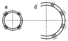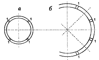 *) Испытания на ударный изгиб для швов, выполненных стыковой контактной сваркой, проводят только на стыках, подвергнутых термообработке. **) Испытания на ударный изгиб по ЗТВ проводят только в случае дуговой сварки. Рис. 2. Схема вырезки темплетов для изготовления образцов для механических испытаний при аттестации технологии сварки: а - для труб диаметром 530 мм и более; б - для труб диаметром 1020 мм и более 1 - образцы для испытания на растяжение; 2 - образцы для испытания на угол загиба «корнем наружу»; 3 - образцы для испытания на угол загиба «корнем внутрь»; 4 - ударные образцы; 5 - образцы для испытания на «ребро» (из каждого темплета - по два образца). В том случае, когда образцы вырезают из целого стыка труб диаметром 1020 мм и более, вместо образцов 2, 3 вырезают образцы 5. 2.6. Образцы для испытания на растяжение и ударный изгиб, а также стандартные образцы для испытания на статический изгиб изготавливают и испытывают в соответствии с ГОСТ 6996. Испытание на растяжение сварного соединения труб должно проводиться на поперечных плоских образцах типа XII или XIII с удалением выпуклости (усиления) шва по ГОСТ 6996. Испытания на ударный изгиб сварного соединения проводят на поперечных образцах типа IX или XI по ГОСТ 6996 с V-образным надрезом (образцы Шарпи). При испытании металла шва надрез наносят по его центру, через все слои шва перпендикулярно поверхности трубы, при испытании металла зоны термического влияния - в месте: линия сплавления + 1 - 2 мм в сторону основного металла. При вырезке образцов следует принять во внимание, что одна из чистовых поверхностей образца (после окончательной обработки) должна располагаться на расстоянии 1 - 2 мм от наружной поверхности трубы. При толщине стенки трубы более 19 мм для испытания на ударный изгиб вырезают дополнительно еще 2 комплекта образцов с V-образным надрезом, одна из чистовых поверхностей которых расположена на расстоянии 1 - 2 мм от внутренней поверхности трубы. Для стандартных испытаний на статический изгиб с расположением корня шва внутрь или наружу соответственно применяют образцы типа XXVII по ГОСТ 6996. При испытании на изгиб образцов, вырезаемых в направлении толщины стенки трубы с расположением ширины образца в плоскости, перпендикулярной поверхности трубы (образцы для испытания на «ребро»), применяют образцы типа XXVIIIa по ГОСТ 6996. Ширину таких образцов принимают равной 12,5 мм. При испытании образцов типа XXVII применяют оправку диаметром 4s ± 2 мм, где s - толщина образца (металла трубы), мм; для образцов XVIIIa диаметр оправки составляет 50 ± 2 мм. 2.8. Для сварных соединений, выполненных дуговой сваркой, среднее арифметическое значение угла изгиба образцов при испытании согласно ГОСТ 6996 должно быть не ниже 120°, а его минимальное значение не ниже 100°. Для сварных соединений, выполненных контактной стыковой сваркой, среднее арифметическое значение угла изгиба образцов при испытании согласно ГОСТ 6996 должно быть не ниже 70°, а его минимальное значение - не ниже 40°. При подсчете среднего значения все углы больше 110° принимаются равными 110°. 2.9. Ударную вязкость металла кольцевых сварных соединений газопроводов определяют при температуре испытания - 20 °С. Величина ударной вязкости металла сварных соединений, определяемая на образцах с V-образным надрезом (образцы типа Шарпи) при принятой температуре испытаний, должна быть н
