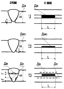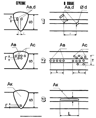 Рис. 7. Схематическое изображение непроваров и несплавлений Да, Дас, Дв, Дс - типы непроваров и несплавлений согласно табл. 7; Г - глубина; L - длина; S - толщина стенки трубы.