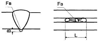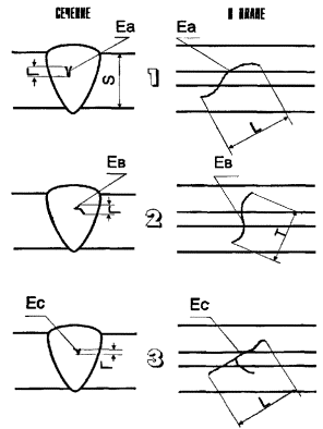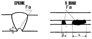 Рис. 9. Условные изображения утяжин, ослаблений в корне шва Fa - согласно табл. 7; Г - глубина утяжины; L - длина ослабления и протяженной утяжины. Рис. 10. Условные изображения провисов (дефект типа «сосулька» - сварка корня шва основными электродами) Fв - согласно табл. 7; В - превышение на внутренней стенке; L - длина дефектного участка. 9.16. Ультразвуковой контроль сварных соединений трубопроводов, выполненный дуговыми способами сварки, должен соответствовать требованиям ГОСТ 14782. Средства контроля должны быть метрологически аттестованы на специальных образцах по методикам, утвержденным Госстандартом. 9.16.1. Контроль можно проводить в ручном, механизированном или автоматизированном режимах. Для ручного контроля и контроля с механизацией сканирования следует применять ультразвуковые эхоимпульсные дефектоскопы, укомплектованные пьезоэлектрическими преобразователями, рассчитанными на рабочую частоту в диапазоне от 1,25 до 5 МГц. Для автоматизированного контроля следует применять оборудование и технологию, обеспечивающие выявление и фиксацию всех недопустимых дефектов сварного шва. При обнаружении дефекта определяют следующие его характеристики: · амплитуду эхо-сигнала от дефекта; ·наибольшую глубину залегания дефекта в сечении шва; ·условную протяженность дефекта; ·суммарную условную протяженность дефектов на оценочном участке. 9.16.2. Дефекты сварных соединений дуговой сварки по результатам ультразвукового контроля относят к одному из следующих видов: ¨непротяженные; ¨протяженные; ¨цепочки и скопления. К непротяженным относят дефекты, условная протяженность которых не превышает 15 мм. К протяженным относят дефекты, условная протяженность которых превышает 15 мм. Цепочкой и скоплением считают три и более дефекта, если при перемещении искателя соответственно вдоль или поперек шва огибающие последовательности эхо-сигналов от этих дефектов при поисковом уровне чувствительности пересекаются (не разделяются). При разделении эхо-сигналов дефекты считают одиночными. • непротяженные дефекты, амплитуда эхо-сигнала от которых превышает амплитуду эхо-сигнала от контрольного отражателя в СОП, или суммарная условная протяженность которых в шве превышает 1/6 периметра шва; • цепочки и скопления, для которых амплитуда эхо-сигнала от любого дефекта, входящего в цепочку (скопление), превышает амплитуду эхо-сигнала от контрольного отражателя в СОП или суммарная условная протяженность дефектов, входящих в цепочку (скопление), более 30 мм на любые 300 мм шва; • протяженные дефекты в сечении шва, амплитуда эхо-сигнала от которых превышает амплитуду эхо-сигнала от контрольного отражателя в СОП или условная протяженность которых более 50 мм на любые 300 мм шва; • протяженные дефекты в корне шва, амплитуда эхо-сигналов от которых превышает амплитуду эхо-сигналов от контрольного отражателя в СОП или условная протяженность такого дефекта превышает 1/6 периметра шва. 9.16.4. При описании результатов контроля следует каждый дефект (или группу дефектов) указывать отдельно и обозначать в приведенной ниже последовательности: • буквой, определяющей вид дефекта по протяженности; • цифрой, определяющей наибольшую глубину залегания дефекта, мм; • цифрой, определяющей условную протяженность дефекта, мм; • буквой, определяющей качественно признак оценки 