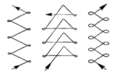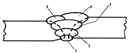2.6.7.2. Если в процессе сварки покрытие качественно изготовленного электрода начинает оплавляться на одну сторону, сварщик должен резко изменить угол наклона электрода или же энергично раскачать его поперек шва до момента исчезновения «козырька» и восстановления равномерного плавления электродного покрытия. 2.6.7.3. Скорость сварки для обеспечения требуемого формирования корневого слоя должна находиться в пределах 14 - 22 м/ч При скорости сварки менее 14 м/ч, как правило, нарушается нормальное формирование шва и возможно образование пор. При скорости сварки свыше 22 м/ч возрастает опасность несплавления кромок и (даже при оптимальном зазоре между свариваемыми кромками) увеличивается опасность непровара. Наличие сквозного проплавления фиксируется по характерному шуму проходящей на вылет дуги. 2.6.8. Особенности техники сварки горячего прохода электродами с покрытием целлюлозного вида. Техника сварки горячего прохода коренным образом отличается от техники сварки корневого слоя шва: • сварка происходит не опиранием, а поддержанием на весу дуги, длина которой изменяется в пределах 1,5 - 2,5 мм; • сварка корневого слоя осуществляется без продольных и поперечных колебаний, а сварка горячего прохода происходит в «рваном» ритме, как с продольными, так и поперечными колебаниями; • сварщик придает торцу электрода резкое продольное возвратно-поступательное движение с достаточно большой амплитудой при переменной длине дуги; • в нижнем положении этой траектории сварщик осуществляет незначительное поперечное колебание торца электрода с задержками на свариваемых кромках при минимальной длине дуги, а затем из положения «задержка» следует резкое, «выметающее» шлак движение вверх-вниз. Этой сложной техникой сварки сварщик достигает несколько целей: • устраняет дефекты, образовавшиеся в металле корневого слоя шва (главным образом, поры); • выплавляет шлак из «раскрытых» при шлифовке абразивным кругом зашлакованных «карманов»; • обеспечивает чуть вогнутую или, по меньшей мере, плоскую ровную подложку для выполнения последующего слоя шва. 2.6.9. Сварка неповоротных стыков труб электродами с покрытием основного вида, включая сварку корневого слоя шва, производится методом на подъем с поперечными колебаниями на минимальной длине дуги: для электродов диаметром 3,0 - 3,25 мм, как правило, не более 1,5 мм; для электродов диаметром 4 мм не более 2 мм. Способы увеличения проплавления при сварке корневого слоя шва показаны в табл. 2.6.2. 2.6.9.1. Не рекомендуется осуществлять сварку техникой резкого выброса сварочной дуги вверх до начала отекания расплавленного металла с последующим его «размазыванием» поперечными колебаниями. Техника сварки должна соответствовать одной из схем, показанных на рис. 2.6.1. Рис. 2.6.1. Типичные манипуляции торцом электрода, обеспечивающие формирование мелкочешуйчатого, равномерного шва при сварке заполняющих и облицовочного слоев шва электродами с покрытием основного вида 2.6.9.2. При наличии отклонения дуги или ее выдувания из разделки кромок необходимо устранить основную причину этого явления - магнитное дутье. С этой целью необходимо: • соблюдать правила подключения полюса «земля», которые требуют симметричного распределения магнитных масс по обе стороны от дуги; • при намагниченных трубах произвести их размагничивание 