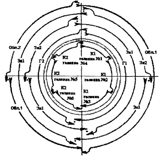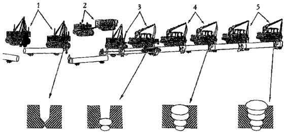 Если число слоев меньше, чем приведено в табл. 2.6.4, стык должен быть вырезан и сварен вновь. Перед возобновлением сварки незаконченного стыка его следует нагреть или просушить в соответствии с пп. 2.3.2 и 2.3.3. 2.6.11. Особенности организации работ при поточно-расчлененном способе сварки 2.6.11.1. Головное сварочное звено линейного потока выполняет технологические операции, регламентированные в п. 2.1.4. 2.6.11.2. Типичным для сварки стыков труб диаметром 1420 мм является следующий состав головного звена: • бригадир; • машинист трубоукладчика; • два слесаря; • два машиниста трактора; • бульдозерист; • четыре электросварщика. 2.6.11.3. Подвоз очередной секции с введением в нее штанги центратора входит в обязанность машиниста трубоукладчика и одного из слесарей. 2.6.11.4. Устанавливать секцию на внутренний центратор (когда разжат только первый ряд жимков) должны бригадир, слесарь и машинист трубоукладчика. 2.6.11.5. После установки секции на центратор необходимо предварительно подогреть концы стыкуемых труб. Подогрев входит в обязанности бригадира и одного из слесарей. 2.6.11.6. По окончании подогрева и замеров температуры производится центровка стыка и установка зазора. Зазор рекомендуется устанавливать без прихваток. Секцию следует устанавливать так, чтобы минимальный зазор был в верхней точке стыка. Затем следует произвести разжатие второго ряда жимков центратора. При этом начальный зазор в нижней точке стыка не должен превышать 10 мм. Начальный зазор на вертикальных участках стыка с обеих сторон должен быть одинаковым, что достигается движением стрелы трубоукладчика «от себя» или «на себя». Машинист трубоукладчика по команде бригадира опускает свободный конец секции на величину, соответствующую достижению конечного равномерного зазора по всему периметру стыка (см. табл. 2.6.2). 2.6.11.7. В случае трубы диаметром 1420 мм сварку корневого слоя выполняют одновременного четыре сварщика. Во избежание непроваров начальные участки швов, выполняемые «нижними» сварщиками, должны быть удалены (прорезаны) на длине не менее 20 мм абразивным кругом. 2.6.11.8. Операцию зачистки и шлифовки корневого слоя шва можно по времени частично совместить со сваркой корневого слоя шва, и горячего прохода, т.е. дизелисты могут приступать к шлифовке верхней части периметра до окончания сварки корневого слоя шва и могут заканчивать ее в то время, когда электросварщики приступили к сварке горячего прохода. 2.6.11.9. После завершения горячего прохода, сварку которого выполняют те же четыре сварщика, трубоукладчик плавно поднимает секцию вверх и под ее свободный конец подкладывают инвентарную лежку. Затем секция плавно опускается и трубоукладчик направляется за следующей секцией. Жимки центратора сжимаются и центратор перемещается бульдозером к месту сборки следующего стыка. Величина свободного подъема торца секции из положения при сварке корневого слоя и горячего прохода не должна превышать 80 см. 2.6.11.10. Типичное время исполнения отдельных операций и темп сварки стыков труб диаметром 1420 и 1020 мм приведены на схеме таблиц 2.6.5 и 2.6.6. Таблица 2.6.5 Поточно-расчлененный метод организации сварки стыков труб Æ1420 мм