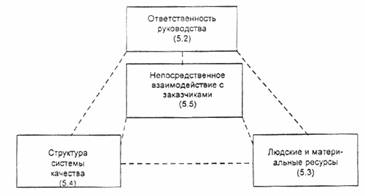 Рис. 2 Ключевые аспекты системы качества 5.2 Ответственность руководства5.2.1 Общие положения Руководство несет ответственность за разработку политики в области качества услуги и удовлетворения заказчика. Ее успешная реализация зависит от того внимания, которое руководство уделяет разработке и эффективному функционированию системы качества. 5.2.2 Политика в области качества На высшее руководство возлагаются ответственность и обязательства сервисной организации за политику в области качества. Оно должно разработать и документально оформить политику в области качества, касающуюся: - уровня качества предоставляемой услуги; - образа сервисной организации и ее репутации в области качества; - целей обеспечения качества услуги; - выбора подхода к достижению целей в области качества; - роли персонала компании, ответственного за реализацию политики в области качества. Руководство должно обеспечить, чтобы политика в области качества публиковалась, была понятной, осуществимой и проводилась в жизнь. Реализация политики в области качества требует определения первоочередных задач по достижению целей в области качества. Первоочередные задачи должны включать: - постоянное удовлетворение требований заказчика с точки зрения профессиональных стандартов и этики; - непрерывное повышение качества услуги; - учет социальных потребностей и необходимости защиты окружающей среды; - эффективность при предоставлении услуги. Руководство должно преобразовать первоочередные задачи в набор целей и мероприятий в области качества. Примерами этого могут служить: - четкое определение потребностей заказчика и соответствующих мер в области качества; - принятие профилактических мер и урегулирование, чтобы предупредить неудовлетворенность заказчика; - оптимизация расходов, связанных с качеством, с целью достижения требуемого исполнения услуги и ее уровня качества; - вовлечение всего персонала организации в создание требуемого уровня качества; - непрерывный анализ требований, предъявляемых к услуге и достигнутого уровня, чтобы определить возможности по повышению качества услуг; - предупреждение неблагоприятного влияния сервисной организации на общество и окружающую среду. 5.2.4 Ответственность и полномочия лиц, занятых в области качества Для достижения целей в области качества руководство должно создать структуру системы качества, обеспечивающую эффективность управления, оценку и повышение качества услуги на всех этапах ее предоставления. Следует подробно определить общую и конкретную ответственность и полномочия всего персонала, чья деятельность оказывает влияние на качество услуги. Сюда же относится обеспечение эффективной связи между заказчиком и поставщиком во всех случаях их непосредственного взаимодействия в рамках и вне сервисной организации. Ответственность и полномочия должны соответствовать средствам и методам, необходимым для достижения качества услуги. Высшее руководство должно нести ответственность за разработку требований к системе качества. Оно должно или само выполнять эту обязанность, или назначить своего представителя, ответственного за создание систем качества, ее проверку, проведение постоянного анализа и принятие мер по ее совершенствованию. В то время как персонал с конкретно определенными обязанностями 