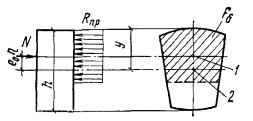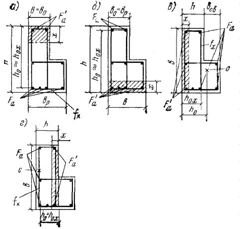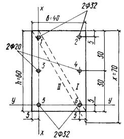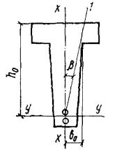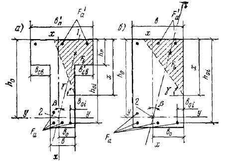 Rпрbx(h0 - 0,5x) + Rпр(b'п - b)h'п(h0 - 0,5h'п) = 115·20·19(53 - 0,5·19) + 115(40 - 20)10(53 - 0,5·10) = 3050000 кгс·см = 30 тс·м > M = 25 тс·м, т.е. прочность сечения обеспечена. Элементы, работающие на косой изгиб3.25. Расчет прямоугольных, тавровых, двутавровых и Г-образных сечений элементов, работающих на косой изгиб, допускается производить, принимая форму сжатой зоны по рис. 6, при этом должно удовлетворяться условие Mх ≤ Rпр[Sсв.х + Fреб(h0 - x/3)] + Rа.сSа.х, (35) Рис. 6. Форма сжатой зоны в поперечном сечении железобетонного элемента, работающего на косой изгиб а - таврового сечения; б - прямоугольного сечения; 1 - плоскость действия изгибающего момента; 2 - центр тяжести сечения растянутой арматуры Рис. 7. Сечение с растянутыми арматурными стержнями в плоскости оси x 1 - плоскость действия изгибающего момента где Mх - составляющая изгибающего момента в плоскости оси x (за оси x и y принимаются две взаимно перпендикулярные оси, проходящие через центр тяжести сечения растянутой арматуры, параллельно сторонам сечения; для сечения с полкой ось x принимается параллельно плоскости ребра); Fреб = Fб - Fсв; (36) Fб - площадь сжатой зоны бетона, равная Fсв - площадь наиболее сжатого свеса полки; x - размер сжатой зоны бетона по наиболее сжатой боковой стороне сечения, определяемый по формуле Sсв.х - статический момент площади Fсв в плоскости оси x относительно оси y; Sсв.у - то же, в плоскости оси y относительно оси x; b0 - расстояние от центра тяжести сечения растянутой арматуры до наиболее сжатой боковой грани ребра (стороны); Sа.х - статический момент площади сечения сжатой арматуры в плоскости оси x относительно оси y; Sа.у - то же, в плоскости оси y относительно оси x; Mу - составляющая изгибающего момента в плоскости оси y. Если растянутые арматурные стержни располагаются в плоскости оси x (рис. 7), значение x вычисляют только по формуле где
