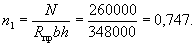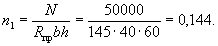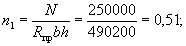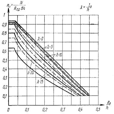 3.8. Расчет внецентренно-сжатых бетонных элементов прямоугольного сечения с учетом прогиба при марке бетона не выше М 250 допускается производить при помощи графика на рис. 3. При этом должно выполняться условие: N ≤ n1Rпрbh, где n1 - определяется по графику рис. 3 в зависимости от значений e0/h и λ = l0/h. 3.9(3.7). Расчет элементов бетонных конструкций на местное сжатие (смятие) должен производиться согласно указаниям пп. 3.95 и 3.96. Рис. 3. График несущей способности внецентренно-сжатых бетонных элементов (сплошная линия - при M1дл/M1 = 1, пунктирная - при M1дл/M1 = 0,5) Изгибаемые элементы3.10(3.8). Расчет изгибаемых бетонных элементов должен производиться из условия M ≤ RрWт, (11) где Wт - определяется по формуле (7); для элементов прямоугольного сечения значение Wт принимается равным