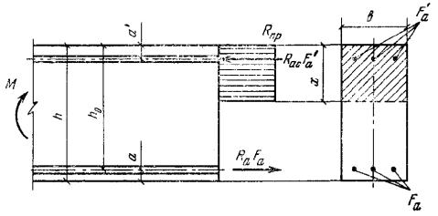 то расчетную несущую способность сечения можно несколько увеличить, производя расчет по формулам (16) и (17) без учета сжатой арматуры. 3.17. Изгибаемые элементы рекомендуется проектировать так, чтобы обеспечить выполнение условия ξ < ξR. Невыполнение этого условия можно допустить в случае, когда площадь сечения растянутой арматуры определена из расчета по предельным состояниям второй группы или принята по конструктивным соображениям. Рис. 4. Схема расположения усилий в поперечном прямоугольном сечении изгибаемого железобетонного элемента 3.18. Проверка прочности прямоугольных сечений с одиночной арматурой производится: при x ≤ ξRh0 - из условия M ≤ RаFа(h0 - 0,5x), (20) где высота сжатой зоны равна