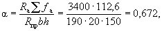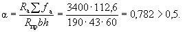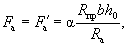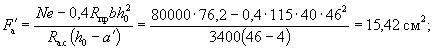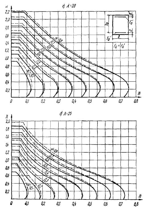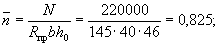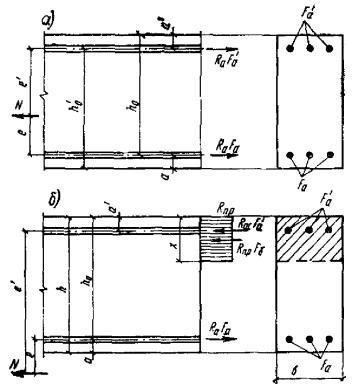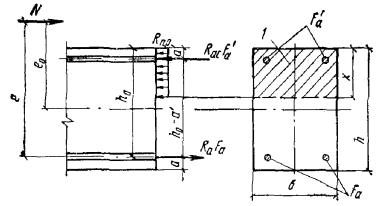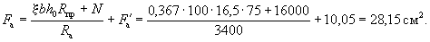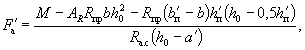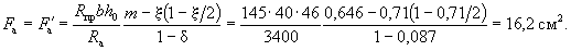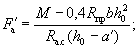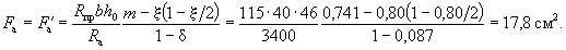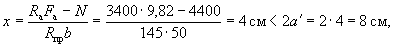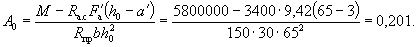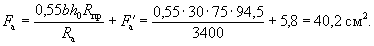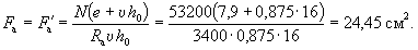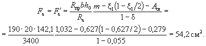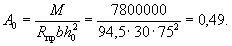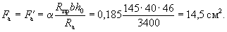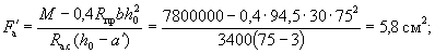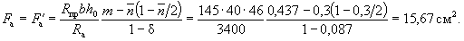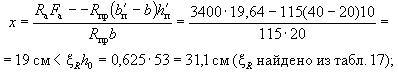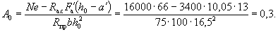 Так как A0 = 0,49 > AR = 0,429 (см. табл. 17 при mб1 = 1), то при заданных размерах сечения и марке бетона необходима сжатая арматура. Далее расчет ведем согласно указаниям п. 3.20. Принимая величину a' = 3 см, по формулам (24) и (25) определяем необходимую площадь сечения сжатой и растянутой арматуры: