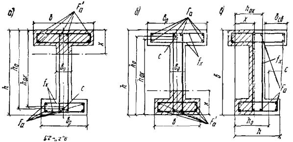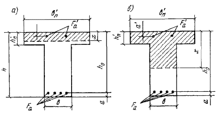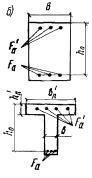Тавровые и двутавровые сечения3.21(3.16). Расчет сечений, имеющих полку в сжатой зоне (тавровых, двутавровых и т.п.) и арматуру, сосредоточенную у сжатой и у растянутой грани, должен производиться в зависимости от положения границы сжатой зоны: а) если граница сжатой зоны проходит в полке (рис. 5,а), т.е. соблюдается условие RаFа ≤ Rпрb'пh'п + Rа.сF'а, (27) расчет производится как для прямоугольного сечения шириной b'п в соответствии с указаниями пп. 3.16 и 3.18; б) если граница сжатой зоны проходит в ребре (рис. 5,б), т.е. условие (27) не соблюдается, расчет производится из условия M ≤ Rпрbx(h0 - 0,5x) + Rпр(b'п - b)h'п(h0 - 0,5h'п) + Rа.сF'а(h0 - a'). (28) При этом высота сжатой зоны бетона x определяется по формуле и принимается не более ξRh0 (см. табл. 17). Если x > ξRh0, условие (28) можно записать в виде M ≤ ARRпрbh02 + Rпр(b'п - b)h'п(h0 - 0,5h'п) + Rа.сF'а(h0 - a'), (30) где AR - см. табл. 17 п. 3.15. При этом следует учитывать указания п. 3.17. Рис. 5. Форма сжатой зоны в поперечном сечении таврового железобетонного элемента а - при расположении границы сжатой зоны в полке; б - при расположении границы сжатой зоны в ребре Примечания: 1. При переменной высоте свесов полки допускается принимать значение h'п равным средней высоте свесов. 2. Ширина сжатой полки b'п, вводимая в расчет, не должна превышать величины, указанной в п. 3.24. 3.22. Требуемая площадь сечения сжатой арматуры при ξRh0 > h'п определяется по формуле