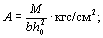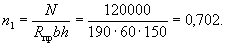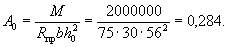 При этом должно удовлетворяться условие A0 ≤ AR (см. табл. 17). 3.24(3.16). Вводимая в расчет ширина сжатой полки b'п принимается из условия, что ширина свеса в каждую сторону от ребра должна быть не более 1/6 пролета элемента и не более: а) при наличии поперечных ребер или при h'п ≥ 0,1h - 1/2 расстояния в свету между продольными ребрами; б) при отсутствии поперечных ребер (или при расстояниях между ними, больших чем расстояния между продольными ребрами) и h'п < 0,1h - 6h'п; в) при консольных свесах полки: при h'п ≥ 0,1h - 6h'п; при 0,05h ≤ h'п < 0,1h - 3h'п; при h'п < 0,05h - свесы не учитываются. Примеры расчетаПрямоугольные сечения Пример 1. Дано: размеры сечения b = 30 см; h = 60 см; a = 4 см; mб1 = 0,85 (нагрузки малой суммарной длительности отсутствуют); расчетный изгибающий момент M = 20 тс·м; бетон марки М 200 (Rпр = 75 кгс/см2); арматура класса А-II (Rа = 2700 кгс/см2). Требуется определить площадь сечения продольной арматуры. Расчет. h0 = 60 - 4 = 56 см. Подбор продольной арматуры производим согласно п. 3.19. По формуле (22) вычисляем значение A0: