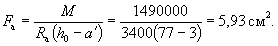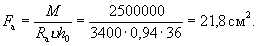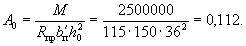 Площадь сечения растянутой арматуры вычисляем по формуле (23). Для этого по табл. 18 при A0 = 0,112 находим υ = 0,94. Тогда