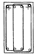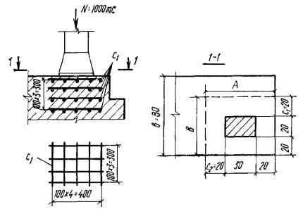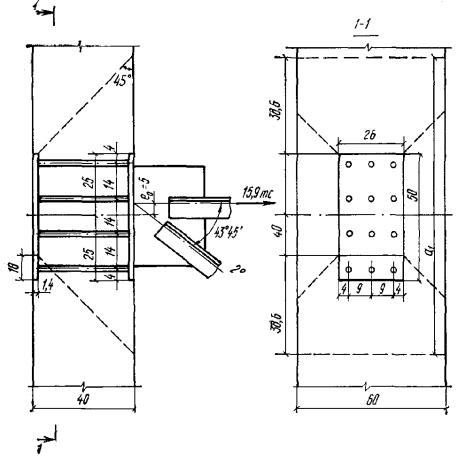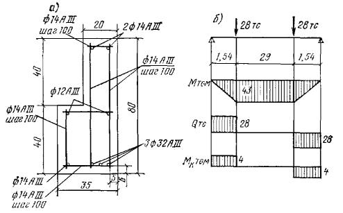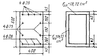 Так как значение Qхб2 больше, чем усилие Q = 13200 кгс за первым грузом, длину участка с шагом хомутов u1 = 10 см принимаем равным расстоянию от опоры до первого груза, т.е. l1 = c1 = 60 см. Рис. 22. К примеру расчета 13 Рис. 23. К примеру расчета 15 Пример 14. Дано: балка днища резервуара с размерами поперечного сечения b = 25 см, h = 50 см, h0 = 45 см; бетон марки М 200 (Rпр = 75 кгс/см2, Rр = 6,5 кгс/см2 с учетом mб1 = 0,85); хомуты из арматуры класса А-I (Rа.х = 1700 кгс/см2); поперечная сила на опоре Q = 20 тс; равномерно распределенная нагрузка от давления воды, приложенная к верхней грани балки, 6 тс/м; нагрузка от собственного веса балки 0,4 тс/м. Требуется определить шаг и диаметр хомутов. Расчет. Проверяем требование п. 3.30: 0,35Rпрbh0 = 0,35·75·25·45 = 29,5 > Q =20 тс. Так как 0,6Rрbh0 = 0,6·6,5·25·45 = 4390 кгс < Q, согласно п. 3.31 расчет по прочности наклонных сечений необходим. Согласно п. 5.73, шаг хомутов u должен быть не более 1/3h и не более 500 мм. Принимаем шаг хомутов u = 15 см < 1/3h. Необходимую интенсивность хомутов найдем по формуле (56) с учетом разгружающего влияния сплошной равномерно распределенной нагрузки (см. п. 3.37). Суммарная сплошная равномерно распределенная нагрузка с учетом нагрузки от собственного веса балки равна: p1 = p = 6 + 0,5·0,4 = 6,2 тс/м = 62 кгс/см. Тогда