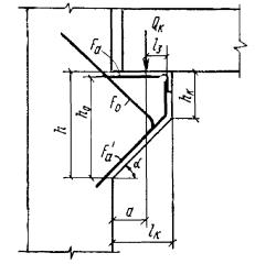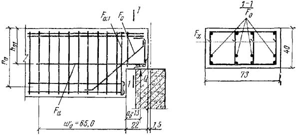 a0 - расстояние от опоры консоли до конца подрезки; d - диаметр обрываемого стержня. Хомуты и отгибы, установленные у конца подрезки, должны удовлетворять условию RаFх1 + RаFоsinα ≥ Q1(1 - h01/h0), (77) где h01 и h0 - рабочая высота соответственно в короткой консоли подрезки и в элементе вне подрезки. При выполнении условия (77) расчет на изгиб наклонного сечения, проходящего через входящий угол подрезки, допускается производить из условия где M - изгибающий момент в нормальном сечении у конца подрезки; p - равномерно распределенная нагрузка, действующая на элемент. Расчетное сопротивление продольной арматуры в короткой консоли, образованной подрезкой, определяется с учетом указаний п. 3.46. Примеры расчетаРасчет наклонных сечений на действие поперечной силы Пример 11. Дано: железобетонная балка с размерами поперечного сечения b = 10 см; h = 30 см; h0 = 27 см; бетон марки М 200 (Rпр = 75 кгс/см2; Rр = 6,5 кгс/см2, с учетом mб1 = 0,85); балка армирована двумя плоскими каркасами, поперечные стержни из арматурной проволоки класса В-I (Rа.х = 2200 кгс/см2), диаметром 5 мм (Fх = 0,39 см2) с шагом u = 10 см; поперечная сила на опоре Q = 5,2 тс. Требуется проверить прочность наклонных сечений балки по поперечной силе. Расчет. Проверяем условие (46), п. 3.30. 0,35Rпрbh0 = 0,35·75·10·27 = 7090 кгс > Q = 5200 кгс. Так как 0,6Rрbh0 = 0,6·6,5·10·27 = 1053 кгс < Q = 5200 кгс, согласно п. 3.31, проверка прочности наклонных сечений необходима. Кроме того, должны соблюдаться требования п. 3.33:
