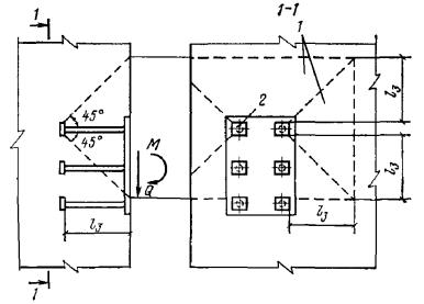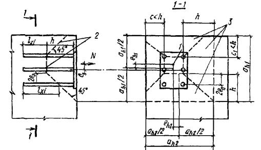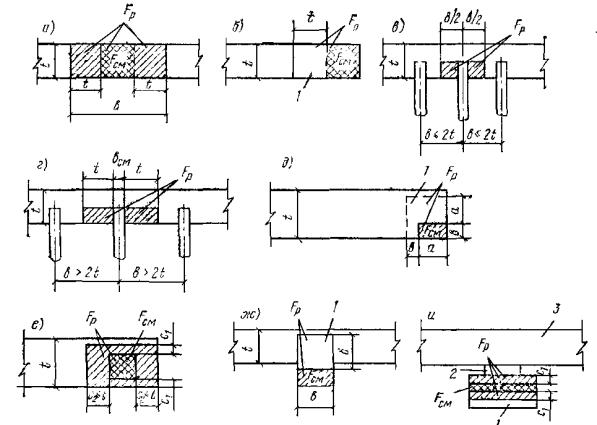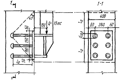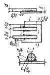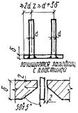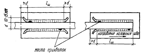 При действии на анкерные стержни только сдвигающих или сжимающих усилий длина анкерных стержней может приниматься на 5d меньше значений lан, определенных по формуле (308) или по табл. 41, но не менее минимальных величин lан согласно требованиям п. 5.48, а для сборных элементов заводского изготовления - не менее 15d. 5.116(5.45). Указанная в п. 5.115 длина анкерных стержней может быть уменьшена при условии приварки на концах стержней анкерных пластин или устройства высаженных горячим способом анкерных головок диаметром не менее 2d или обжатием шайб. В этих случаях длина анкерного стержня определяется расчетом на выкалывание и смятие бетона и принимается не менее 10d (d - диаметр анкера). Анкерные пластины должны удовлетворять требованиям п. 5.49,а. При возможности образования трещин в бетоне вдоль анкеров (σб > Rр) устройство усилений на концах анкеров в виде пластинок, шайб или высаженных головок обязательно. При определении длины заготовок нормальных анкеров следует учитывать припуск на осадку при сварке, который может приниматься равным диаметру анкера. Длину заготовок следует назначать кратной 10 мм. Сварные соединения закладных деталей5.117. Сварные соединения анкеров с пластинами втавр должны проектироваться в соответствии с указаниями табл. 49. Рекомендуется предусматривать дуговую сварку втавр под слоем флюса или контактную рельефно-точечную сварку. Ручную дуговую сварку в раззенкованные отверстия из-за большой трудоемкости следует применять при невозможности использовать рекомендуемые способы сварки. 5.118. Сварные соединения анкеров и арматурных стержней с пластинами внахлестку должны проектироваться в соответствии с указаниями табл. 50. Рекомендуется преимущественное применение контактной рельефно-точечной сварки. Сварные швы при сварке элементов пластин между собой должны назначаться по нормам проектирования стальных конструкций. 5.119. Для закладных деталей сборных железобетонных конструкций, подвергающихся действию вибрационных нагрузок, применение рельефно-точечной сварки не допускается. 5.120. Во избежание поджога стержней при ручной дуговой сварке швы должны начинаться с пластины и выводиться на пластину, а места прихваток - провариваться. При назначении размеров пластин необходимо это учитывать в соответствии с указаниями, приведенными на рис. 129. Рис. 129. Ручная дуговая сварка внахлестку фланговыми швами Таблица 49