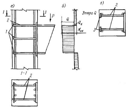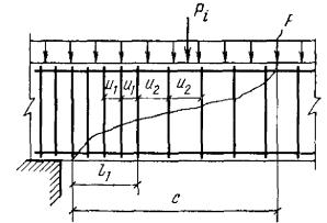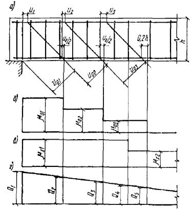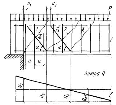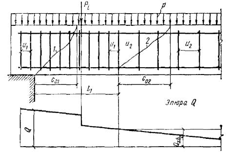 здесь c - длина проекции наклонного сечения на продольную ось элемента. Рис. 11. Схема усилий, действующих в наклонном сечении изгибаемого элемента с поперечной арматурой, при расчете по поперечной силе Рис. 12. Определение расчетного значения поперечной силы 3.33(3.35). Для хомутов, устанавливаемых по расчету, в элементе с поперечной нагрузкой в пределах его пролета должно удовлетворяться условие При этом, если выполняются указания пп. 3.42 и 3.43, условие (50) можно не проверять. Расстояния между хомутами u, между опорой и концом отгиба, ближайшего к опоре, u1, а также между концом предыдущего и началом последующего отгиба u2 (рис. 14) должны быть не более величины Кроме того, поперечное армирование элемента независимо от результатов расчета должно удовлетворять конструктивным требованиям, приведенным в пп. 5.72 - 5.74. 3.34. В элементах, рассчитываемых только на фиксированные нагрузки, в том числе на сплошные распределенные нагрузки (например, гидростатическое давление), расчетную поперечную силу Q следует определять с учетом разгружающего влияния нагрузки, приложенной к элементу в пределах длины проекции наклонного сечения, если эта нагрузка приложена по грани элемента и действует в его сторону (например, в горизонтальном элементе - нагрузка, действующая сверху вниз и приложенная к верхней грани). Расчет элементов, армированных хомутами без отогнутых стержней3.35. Проверка прочности по поперечной силе производится для невыгоднейших сечений, начинающихся у опоры и в местах изменения интенсивности хомутов (рис. 13), из условия Q ≤ Qх.б (52) где Q - поперечная сила в нормальном сечении у начала рассматриваемого наклонного сечения (у опоры и в местах изменения интенсивности поперечного армирования); Qх.б - предельная поперечная сила, воспринимаемая бетоном и хомутами в невыгоднейшем наклонном сечении, определяемая по формуле здесь qх - усилие в хомутах на единицу длины элемента в пределах наклонного сечения, определяемое по формуле При этом длина проекции невыгоднейшего наклонного сечения определяется по формуле 3.36. Определение требуемой интенсивности хомутов производится из формулы где Q и qх - см. п. 3.35. 3.37. При расчете элемента на действие равномерно распределенной нагрузки p, приложенной по грани элемента и действующей в его сторону, допускается в формулы (53), (55) и (56) вместо величины qх подставлять величину (qх + p1), где значение p1 определяется следующим образом: а) если нагрузка на отдельных участках пролета может отсутствовать и эпюра M от принятой в расчете равномерно распределенной нагрузки p всегда огибает любую действительную эпюру M (например, нагрузка на перекрытия) - p1 = p/2; б) если равномерно распределенная нагрузка фиксированная и сплошная (например, гидростатическое давление) - p1 = p, при этом собственный вес, входящий в нагрузку p1, учитывается в ней с коэффициентом 0,5. в) в прочих случаях - p1 = 0. Рис. 13. Места расположения невыгоднейших наклонных сечений при расчете по поперечной силе и определение места изменения интенсивности хомутов 1 и 2 - невыгоднейшие наклонные сечения При действии фиксированной сосредоточенной силы Pi, приложенной к верхней грани элемента в пределах невыгоднейшего наклонного сечения с длиной проекции c0 (см. п. 3.35), допускается расчет из условия (52) производить на действие поперечной силы, равной Q - Pi; при этом следует проверить