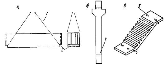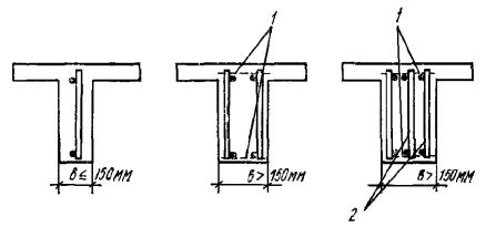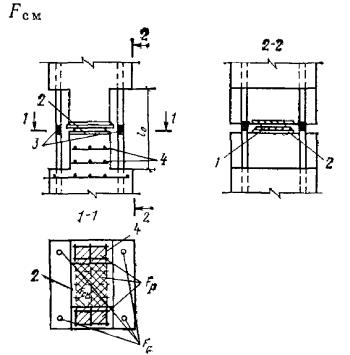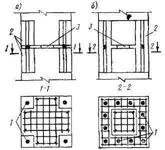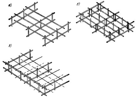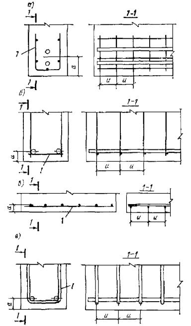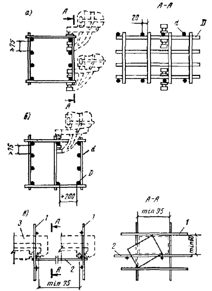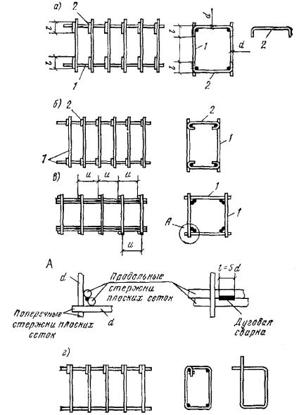 Рис. 95. Примеры пространственных каркасов железобетонных элементов, изготовляемых при помощи сварочных клещей а - сварка стержней внешних углов каркасов линейных конструкций; б - сварка промежуточных стержней каркасов линейных конструкций; в - сварка стержней узкой сетки со стержнями двух широких сеток для плоских конструкций; 1 - широкая сетка; 2 - узкая сетка; 3 - сварочные клещи для сварки стержней обоих направлений диаметром до 16 мм Рис. 96. Примеры рекомендуемых конструкций пространственных каркасов линейных элементов, собираемых с применением контактной точечной сварки а - из двух сеток и соединительных стержней, привариваемых к продольной арматуре сеток; б - из гнутых сеток и соединительных стержней; в - с навивкой спиральной поперечной арматуры на продольную арматуру; г - из заранее согнутых и сваренных хомутов, нанизанных на продольные стержни; д - из сетки, согнутой до получения замкнутого контура; е - из четырех плоских сеток; ж - из двух сеток и монтажных стержней, перпендикулярных плоскости изгиба, привариваемых к поперечной арматуре сеток (в балках, не работающих на кручение, и в колоннах при общем насыщении продольной арматурой не более 3 %) 5.34. При отсутствии сварочных клещей образование пространственных каркасов линейных элементов может быть выполнено следующими способами: плоские сетки соединяются при помощи скоб из стержней класса А-I диаметром более 8 мм посредством дуговой сварки их с хомутами (рис. 97,а). В колоннах, в балках, работающих на кручение, а также в сжатой зоне балок с учитываемой в расчете сжатой арматурой длина односторонних сварных швов l должна быть не менее 6d (d - диаметр хомута), в монтажных соединениях - 3d; плоские сетки соединяются при помощи шпилек с вязкой всех пересечений (рис. 97,б) и с обеспечением монтажной жесткости каркаса приваркой стержней, планок и т.п.; плоские сетки соединяются между собой путем дуговой сварки продольных стержней (рис. 97,в) возле всех мест приварки хомутов. Длина швов l не менее 5d (d - диаметр хомута). Такие соединения допускаются при насыщении сечения сжатой арматурой не более 3 %; вязаные пространственные каркасы образуются из продольных стержней и гнутых хомутов с вязкой пересечений и присоединением элементов жесткости (рис. 97,г). Из-за большой трудоемкости каркасы, приведенные в п. 5.34, могут применяться лишь в виде исключения. Рис. 97. Примеры пространственных каркасов линейных элементов, собираемых без применения контактной точечной сварки а - из двух плоских сеток и скоб, привариваемых к поперечной арматуре сеток; б - из двух плоских сеток, соединяющихся при помощи шпилек с вязкой всех пересечений; в - из четырех плоских сеток; г - из продольных стержней и гнутых хомутов с вязкой пересечений; 1 - плоская сетка; 2 - скоба или шпилька 5.35. Образование пространственных каркасов для армирования плоских элементов типа плит, стеновых панелей и т.п. рекомендуется производить следующим образом. Плоские каркасы типа «лесенка» соединяются посредством соединительных стержней, привариваемых с помощью сварочных клещей (рис. 98,а). Плоские сетки типа «лесенка» одного направления соединяются при помощи таких же плоских сеток другого направления и меньшей высоты (рис. 98,б). Соединения пересечений осуществляются клещами; при их отсутствии допускается вязка. Пространственный каркас ребристы