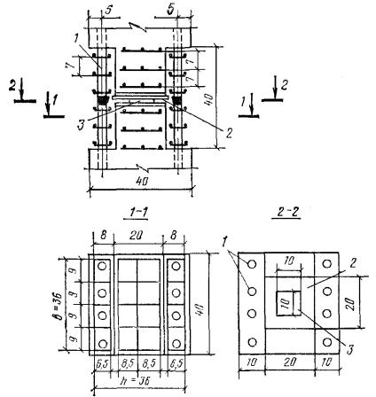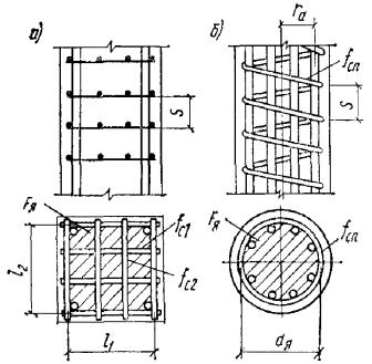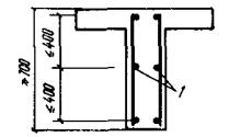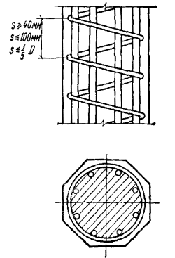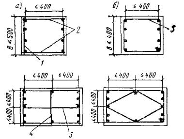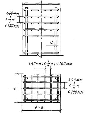 Требования настоящего пункта не учитываются при назначении площади сечения арматуры, устанавливаемой по контуру плит или панелей из расчета на изгиб в плоскости плиты (панели). Минимальное армирование стеновых панелей принимается в соответствии с инструкцией по проектированию панельных жилых зданий. 5.58(5.22). У всех поверхностей железобетонных элементов, вблизи которых ставится продольная арматура, должна предусматриваться также поперечная арматура, охватывающая крайние продольные стержни. При этом расстояния между поперечными стержнями у каждой поверхности элемента должны быть не более 500 мм и не более удвоенной ширины грани элемента. Поперечную арматуру можно не ставить у граней тонких ребер изгибаемых элементов (шириной 150 мм и менее), по ширине которых располагается лишь один продольный стержень, каркас или одна сетка. 5.59. Соответствие расположения арматуры ее проектному положению должно обеспечиваться специальными мероприятиями по фиксации арматуры согласно пп. 5.121 - 5.124. Армирование сжатых элементовПродольная арматура5.60(5.17). Диаметр продольных стержней сжатых элементов не должен превышать для бетона марок ниже М 300 - 40 мм. Для особо мощных колонн при марке бетона выше М 200 и соответствующем технологическом обеспечении (резка, сварка и т.п.) могут применяться стержни диаметром более 40 мм. В колоннах с размером меньшей стороны сечения 250 мм и более диаметр продольных стержней рекомендуется назначать не менее 16 мм. Диаметр продольных стержней внецентренно-сжатых элементов монолитных конструкций должен быть не менее 12 мм. 5.61(5.18). В линейных внецентренно-сжатых элементах расстояние между осями стержней продольной арматуры должно приниматься не более 400 мм. При расстоянии между рабочими стержнями более 400 мм надлежит ставить конструктивную арматуру диаметром не менее 12 мм с тем, чтобы расстояния между продольными стержнями были не более 400 мм. 5.62(5.19). Во внецентренно-сжатых элементах, несущая способность которых при заданном эксцентрицитете продольной силы используется менее чем на 50 %, а также в элементах с гибкостью l0/r < 17 (например, подколонники), где по расчету сжатая арматура не требуется, а число растянутой арматуры не превышает 0,3 %, допускается не устанавливать продольную и поперечную арматуру, требуемую, согласно пп. 5.58, 5.61, 5.63 и 5.64, по граням, параллельным плоскости изгиба. При этом армирование по граням, перпендикулярным к плоскости изгиба, производится сварными каркасами и сетками с толщиной защитного слоя бетона не менее 50 мм и не менее двух диаметров продольной арматуры. Поперечная арматура5.63(5.22). Конструкция поперечной арматуры должна обеспечивать закрепление сжатых стержней от их бокового выпучивания в любом направлении. Во внецентренно-сжатых линейных элементах при наличии учитываемой в расчете сжатой продольной арматуры хомуты должны ставиться на расстояниях не более 500 мм и при вязаных каркасах не более 15d, а при сварных - не более 20d (d - наименьший диаметр сжатых продольных стержней). Расстояния между хомутами внецентренно-сжатых элементов в местах стыкования рабочей арматуры внахлестку без сварки должны составлять не более 10d. Если общее насыщение элемента продольной арматурой составляет более 3 %, хомуты должны устанавливаться на расстояниях не более 10d и не более 300 мм. При проверке соблюдения тр