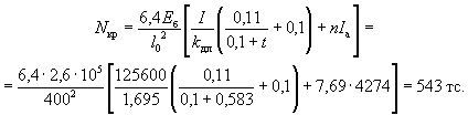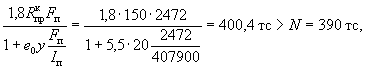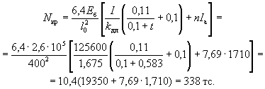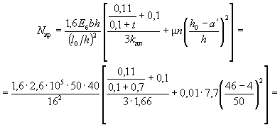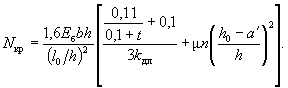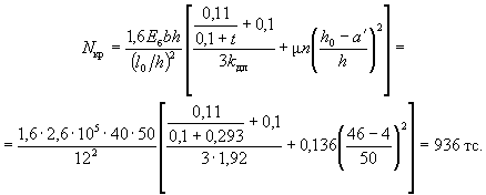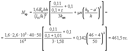 здесь Fи - площадь сжатой зоны бетона, дополненная в растянутой зоне прямоугольником шириной b, равной ширине сечения по нулевой линии, и высотой h - x (рис. 2); Sи - статический момент площади Fи относительно растянутой грани. Допускается значение Wт определять по формуле Wт = γW0, 3.7(3.6). Значение коэффициента η, учитывающего влияние прогиба на величину эксцентрицитета продольного усилия e0, следует определять по формуле где Nкр - условная критическая сила, определяемая по формуле (I - момент инерции бетонного сечения относительно центра тяжести сечения). Для элементов прямоугольного сечения формула (9) имеет вид kдл - коэффициент, учитывающий влияние длительного действия нагрузки на прогиб элемента в предельном состоянии, равный