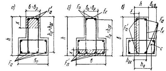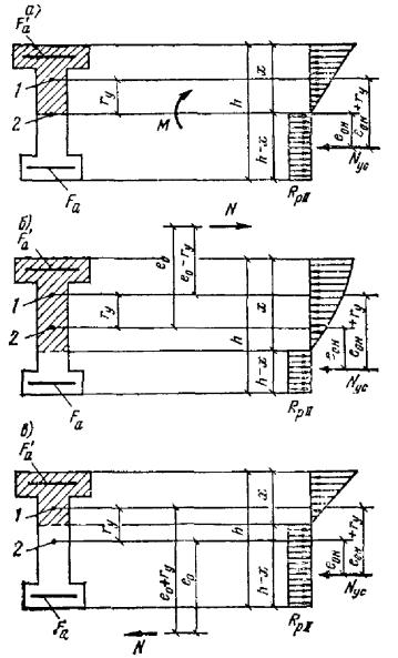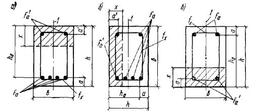 Кроме того, для элементов таврового и двутаврового сечений должно выполняться условие τ ≤ Rр, (13) где τ - касательные напряжения, определяемые как для упругого материала на уровне центра тяжести сечения. РАСЧЕТ ЖЕЛЕЗОБЕТОННЫХ ЭЛЕМЕНТОВ ПО ПРОЧНОСТИ3.11(3.9). Расчет по прочности элементов железобетонных конструкций должен производиться для сечений, нормальных к их продольной оси, а также для наклонных к ней сечений наиболее опасного направления; при наличии крутящих моментов следует проверить прочность пространственных сечений, ограниченных в растянутой зоне спиральной трещиной, наиболее опасного из возможных направлений. Кроме того, должен производиться расчет элементов на местное действие нагрузки (смятие, продавливание, отрыв). Изгибаемые элементыРасчет сечений, нормальных к продольной оси элементаОбщие указания3.12(3.11). Расчет сечений, нормальных к продольной оси элемента, когда изгибающий момент действует в плоскости оси симметрии сечения и арматура сосредоточена у перпендикулярных к указанной плоскости граней элемента, должен производиться в зависимости от соотношения между величиной относительной высоты сжатой зоны бетона ξ = x/h0, определяемой из соответствующих условий равновесия, и граничным значением относительной высоты сжатой зоны бетона ξR (см. п. 3.15), при котором предельное состояние элемента наступает одновременно с достижением в растянутой арматуре напряжения, равного расчетному сопротивлению Rа. 3.13(3.18). Расчет изгибаемых элементов кольцевого сечения при соотношении внутреннего и наружного радиусов r1/r2 ≥ 0,5 с арматурой, равномерно распределенной по длине окружности (при числе продольных стержней не менее 6), должен производиться как для внецентренно-сжатых элементов согласно пп. 3.71 и 3.72, принимая величину продольной силы N = 0 и подставляя вместо Ne0 значение изгибающего момента M. 3.14.
