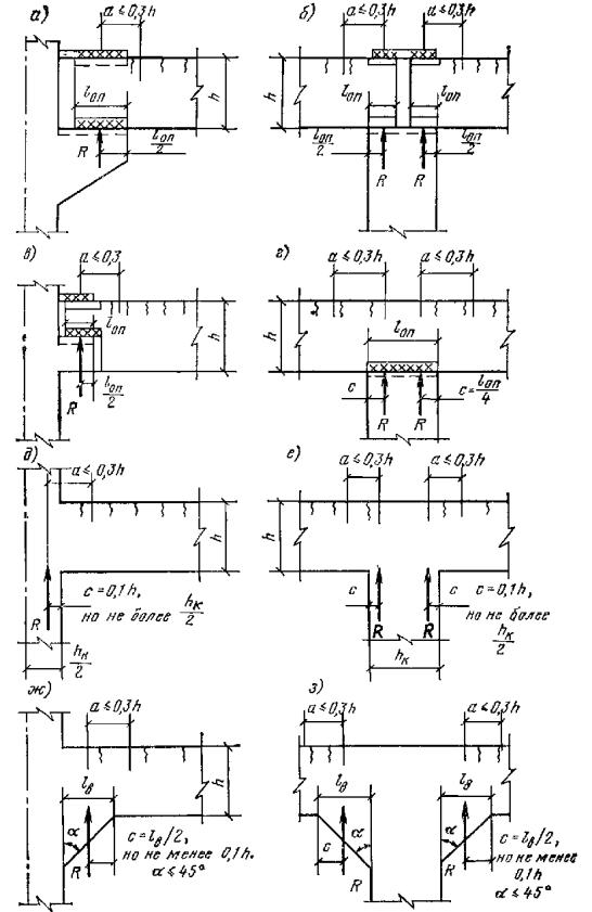 здесь bх и bу - размеры сечения в направлении, нормальном соответственно осям x и y; h0х и h0у - рабочие высоты сечения в направлении соответственно осей x и y; qх(х) и qх(у) - предельные усилия в поперечных стержнях соответственно в направлении осей x и y на единицу длины элемента (см. п. 3.35). Примечание. Отогнутые стержни при расчете на поперечную силу при косом изгибе не учитываются. Расчет наклонных сечений на действие изгибающего момента3.45(3.39). Расчет сечений, наклонных к продольной оси элемента, на действие изгибающего момента (рис. 17) должен производиться из условия M ≤ RаFаz + ΣRаFozо + ΣRаFхzх, (70) где M - момент всех внешних сил, расположенных по одну сторону от рассматриваемого наклонного сечения, относительно оси, проходящей через точку приложения равнодействующей усилий в сжатой зоне и перпендикулярной к плоскости действия момента; если внешняя нагрузка приложена к грани свободно опертой балки и действует в ее сторону, то M - изгибающий момент в нормальном сечении, проходящем через вышеуказанную ось; RаFаz; ΣRаFоzо и ΣRаFхzх - сумма моментов относительно той же оси соответственно от усилий в продольной арматуре, в отогнутых стержнях и в хомутах, пересекающих растянутую зону наклонного сечения; z, zо и zх - расстояния от плоскостей расположения соответственно продольной арматуры, отгибов и хомутов до указанной выше оси. Высота сжатой зоны наклонного сечения, измеренная по нормали к продольной оси элемента, определяется из условия равновесия проекций усилий в бетоне и арматуре наклонного сечения на продольную ось элемента согласно указаниям пп. 3.16 и 3.21. При этом в случае наличия отгибов в элементе в числителе выражений для x добавляются значения ΣRаFоcosα, где α - угол наклона отгибов к продольной оси элемента. Если x < 2a', допускается принимать z = h0 - a'. Рис. 17. Схема усилий, действующих в наклонном сечении, при расчете по изгибающему моменту Nб - равнодействующая усилий в сжатой зоне Рис. 18. Поперечная арматура, учитываемая при определении длины зоны анкеровки а - корытообразная сетка; б - поперечные стержни сварных пространственных каркасов; в - распределительная арматура сварных сеток; г - хомуты вязаных каркасов; 1 - стержни, учитываемые в расчете Проверка на действие изгибающего момента не производится для наклонных сечений, пересекающих растянутую грань элемента на участках, обеспеченных от образования нормальных трещин, т.е. там, где момент M от внешней нагрузки, на которую ведется расчет по прочности, меньше или равен моменту трещинообразования Mт, определяемому по формуле (222) п. 4.3, принимая в ней значения Rр вместо RрII. 3.46. Если наклонное сечение пересекает в пределах зоны анкеровки продольную растянутую арматуру, не имеющую анкеров, то при расчете этого сечения по изгибающему моменту расчетное сопротивление продольной арматуры снижается путем умножения его на коэффициент условий работы mа3, равный mа3 = lх/lан, (71) где lх - расстояние от конца арматуры до точки пересечения наклонного сечения с продольной арматурой; lан - длина зоны анкеровки, определяемая следующим образом: а) для крайних свободных опор длина зоны анкеровки определяется по формуле где mан - коэффициент, принимаемый равным: для стержней периодического профиля mан = 0,5, для гладких стержней mан = 0,8; μк - объемный коэффициент поперечного армирования, определяемый: при наличии хомутов, ох