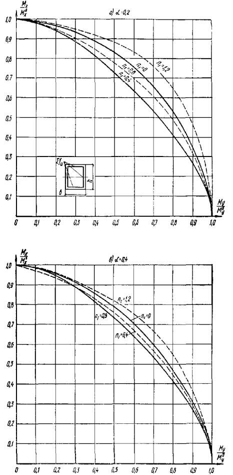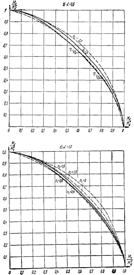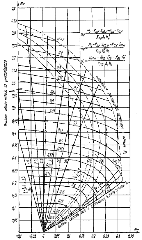 (обозначения см. в п. 3.25). Рис. 9. График несущей способности прямоугольного, таврового и Г-образного сечения для элементов, работающих на косой изгиб Если значение mх меньше нуля, расчет следует производить как для прямоугольного сечения, принимая b = b'п. Если значение α на