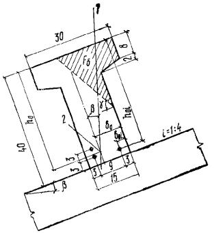 Так как Qмакс = 1875 кгс < k1Rрbh0 + 2p1h0 = 1970 кгс, то условие (66) выполнено, и прочность плиты по поперечной силе обеспечена. Пример 17. Дано: панель резервуара консольного типа с переменной толщиной от 26,2 см в заделке до 12 см на свободном конце и с вылетом 4,25 м загружена боковым давлением грунта, учитывающим нагрузку от транспортных средств на поверхности грунта; давление грунта линейно убывает от 7,06 тс/м2 в заделке до 0,71 тс/м2 на свободном конце; a = 2,2 см; бетон марки М 200 (Rр = 8,5 кгс/см2 при mб1 = 1,1). Требуется проверить прочность панели по поперечной силе. Расчет. Рабочая высота сечения панели в заделке равна h0 = 26,2 - 2,2 = 24 см. Определим tgβ, где β - угол между сжатой и растянутой гранями tgβ = (26,2 - 12)/425 = 0,0334. Расчет ведем для полосы панели шириной b = 100 см. Поперечная сила в заделке равна Qмакс = (7,06 + 0,71)·4,25/2 = 16,5 тс. Проверяем прочность из условий (64) и (68) п. 3.43: 2,5Rрbh0 = 2,5·8,5·100·24 = 51000 кгс > Qмакс = 11,8 тс, т.е. условие (64) выполняется. Определим среднюю нагрузку p на приопорном участке длиной