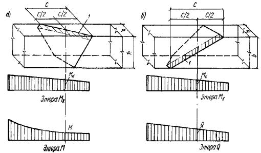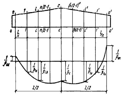 n - четное число равных участков, на которое разбивается пролет элемента; число n рекомендуется принимать не менее 6. В формулах (282) и (283) кривизны 1/ρ определяются по формулам (261) и (281) соответственно для участков без трещин и с трещинами; знак 1/ρ принимается в соответствии с эпюрой кривизны. При определении прогибов статически неопределимых конструкций рекомендуется учитывать перераспределение моментов, вызванных образованием трещин и неупругими деформациями бетона. Для изгибаемых элементов постоянного сечения, имеющих трещины, на каждом участке, в (пределах которого изгибающий момент не меняет знака, кривизну допускается вычислять для наиболее напряженного сечения, принимая кривизну для остальных сечений такого участка изменяющейся пропорционально значениям изгибающего момента (рис. 85). Рис. 84. Эпюра кривизны в железобетонном элементе с переменным по длине сечением Рис. 85. Эпюры изгибающих моментов и кривизны в железобетонном элементе постоянного сечения а - схема расположения нагрузки; б - эпюра изгибающих моментов; в - эпюра кривизны 4.22(4.32). Для изгибаемых элементов при l/h < 10 необходимо учитывать влияние поперечных сил на их прогиб. В этом случае полный прогиб f равен сумме прогибов, обусловленных соответственно деформацией изгиба fM и деформацией сдвига fQ. 4.23(4.33). Прогиб fQ, обусловленный деформацией сдвига, определяется по формуле где γс(x) - деформация сдвига, определяемая по формуле