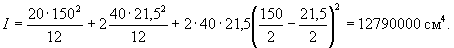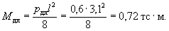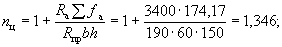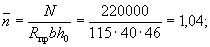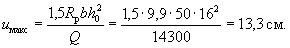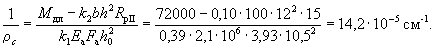 Так как h < 25 см, то полный прогиб равен f = 1,42·1,23 = 1,72 см, что больше предельно допустимого прогиба l/200 = 310/200 = 1,55 см. Поскольку μ = 0,00375 < 0,005, то, согласно п. 4.29 «в», уточняем значение f по формуле (303). Для этого вычисляем величины 1/ρс.у и Mт. Так как рассчитывается слабоармированный элемент, то Mт и Iп определяем как для бетонного сечения Iп = bh3/12 = 100·123/12 = 14400 см4; Mт = 0,292bh2RрII = 0,292·100·122·15 = 63000 кгс·см;
