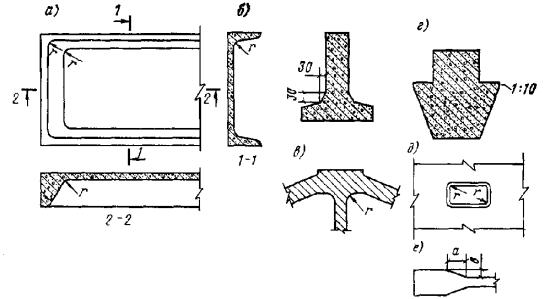 т.е. прогиб плиты меньше предельно допустимого (см. табл. 2). 5. КОНСТРУКТИВНЫЕ ТРЕБОВАНИЯОБЩИЕ УКАЗАНИЯ5.1(5.1). При проектировании бетонных и железобетонных конструкций и изделий для обеспечения условий их экономичного и качественного изготовления, требуемой долговечности и совместной работы арматуры и бетона надлежит выполнять конструктивные требования, изложенные в настоящем разделе. 5.2. Конструкции должны приниматься простого очертания. Следует использовать по возможности арматуру, закладные детали и строповочные петли, выпускаемые в виде товарной продукции по нормалям и ГОСТам. Арматуру следует проектировать в виде укрупненных блоков и пространственных каркасов для сокращения времени укладки в форму (опалубку). Распалубочную и отпускную прочность бетона следует назначать минимально возможными и для ускорения оборота форм (опалубки) и интенсивного использования производственных площадей. Необходимо стремиться к унификации арматуры и закладных деталей в отдельных конструкциях и их сериях, небольшому числу разных марок и диаметров стали, типов арматурных элементов - сеток и каркасов, шагов продольных и поперечных стержней. МИНИМАЛЬНЫЕ РАЗМЕРЫ СЕЧЕНИЯ ЭЛЕМЕНТОВ5.3(5.2). Размеры сечений бетонных и железобетонных элементов, определяемые из расчета по действующим усилиям и соответствующим предельным состояниям, должны назначаться с учетом экономических требований, необходимости унификации форм и армирования, а также условий принятой технологии изготовления конструкций. Кроме того, размеры сечений железобетонных конструкций должны приниматься такими, чтобы соблюдались требования в части расположения арматуры (толщины защитных слоев бетона, расстояния между стержнями и т.п.) и анкеровки арматуры. 5.4(5.3). Толщина* монолитных плит должна приниматься не менее: для покрытий - 40 мм; для междуэтажных перекрытий жилых и общественных зданий - 50 мм; для междуэтажных перекрытий производственных зданий - 60 мм. Минимальная толщина сборных плит должна приниматься из условий обеспечения требуемых толщин защитных слоев бетона и расположения арматуры по толщине плиты (см. пп. 5.36 - 5.45). Размеры сечений внецентренно-сжатых элементов должны приниматься такими, чтобы их гибкость l0/r в любом направлении, как правило, не превышала 200 (для прямоугольных сечений l0/h ≤ 60), а для колонн, являющихся элементами зданий, - 120 (l0/h ≤ 35). * Здесь и далее величины, предписываемые и рекомендуемые настоящим Руководством (размеры сечений, толщина защитного слоя бетона и др.), относятся к номинальным значениям, назначаемым при проектировании и указываемым в чертежах. От этих номинальных значений возможны отклонения в натуре, не превышающие величин, указанных в соответствующих ГОСТах, технических условиях и др. ГАБАРИТЫ И ОЧЕРТАНИЯ ЭЛЕМЕНТОВ КОНСТРУКЦИЙ5.5. Размеры сборных бетонных и железобетонных элементов следует назначать с учетом грузоподъемных средств на заводе-изготовителе и на строительстве. В необходимых случаях следует учитывать возможность подъема железобетонного изделия вместе с формой. При назначении размеров следует учитывать также условия перевозки: транспортные средства и допустимые габариты. 5.6. Во избежание повреждений от местных напряжений при резком изменении направлений граней изделия, например во внутренних углах, рекомендуетс