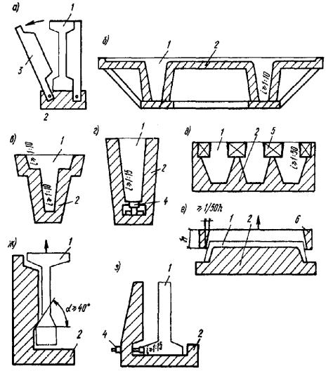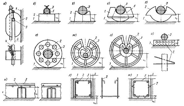 Рис. 130. Фиксирующие устройства однократного использования. Примеры устройств, обеспечивающих требуемую толщину (s) защитного слоя бетона а, б, в - фиксаторы с большой поверхностью контакта с формой, изготовляемые из цементно-песчаного раствора; г - фиксаторы с минимальной поверхностью контакта с формой, изготовляемые из цементно-песчаного раствора; д - то же, из асбестоцемента; е, ж, з - то же из пластмасс (перфорированные); и - то же, из алюминиевой перфорированной полосы; к, л, м - то же, из арматурной стали; 1 - рабочая поверхность формы; 2 - фиксатор; 3 - фиксируемая арматура; 4 - скрутка из вязальной проволоки; 5 - вязальная проволока, заделанная в фиксатор; 6 - эластичное кольцо; 7 - упоры, привариваемые к арматуре ФИКСАЦИЯ АРМАТУРЫ5.121(5.49). Соответствие расположения арматуры ее проектному положению должно обеспечиваться специальными мероприятиями, т.е. применением средств фиксации. Фиксацию арматуры рекомендуется осуществлять с помощью: устройств однократного использования, остающихся в бетоне; инвентарных приспособлений, извлекаемых из бетона до или после его твердения; специальных деталей, прикрепленных к рабочей поверхности формы или опалубки и не препятствующих извлечению железобетонного элемента из формы или снятию с него опалубки. 5.122. Средства фиксации арматуры следует назначать с учетом: конструктивных особенностей элемента; расположения арматуры относительно граней рабочей поверхности формы или опалубки; условий эксплуатации элемента в сооружении. 5.123. Рекомендуется применение следующих фиксаторов однократного использования: для обеспечения требуемой толщины защитного слоя бетона для арматуры - по рис. 130; для обеспечения требуемого расстояния между отдельными арматурными изделиями или стержнями - по рис. 131; для обеспечения одновременно обоих требований, указанных выше, - по рис. 132. Рис. 131. Фиксирующие устройства однократного использования а, б, в - обеспечивающие требуемое расстояние между отдельными арматурными изделиями; г - то же, стержнями; 1 - разделитель из арматурной стали, устанавливаемый между рядами сеток; 2 - фиксатор подкладка для обеспечения защитного слоя бетона; 3 - удлиненные поперечные стержни каркаса, загибаемые вокруг стержней сетки; 4 - фиксатор для соединения перекрещивающихся стержней (пространственная спираль из пружинной проволоки) Рис. 132. Фиксирующие устройства однократного использования, обеспечивающие одновременно толщину защитного слоя бетона и расстояние между отдельными арматурными элементами а - в плоских плитах; б, в - в балках прямоугольного сечения; г - в элементах кольцевого сечения; 1 - фиксатор типа П-образного каркаса; 2 - горизонтальные арматурные сетки; 3 - рабочая поверхность формы; 4 - фиксатор типа гребенки; 5 - вертикальная арматурная сетка; 6 - фиксаторы-стержни, дополнительно привариваемые к каркасам; 7 - фиксатор типа накидной скобы из арматурной проволоки; 8 - концентрически расположенные каркасы Вид фиксатора для обеспечения толщины защитного слоя бетона у лицевых граней элементов следует выбирать согласно рекомендациям, приведенным в табл. 51. Не допускается применение в качестве подкладок обрезков арматурных стержней, полос и т.п. В растянутой зоне бетона элементов, эксплуатируемых в условиях агрессивной среды, не допускается установка пластмассовых подкладок под стержн