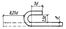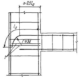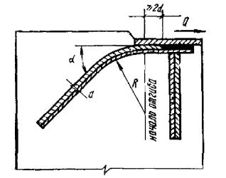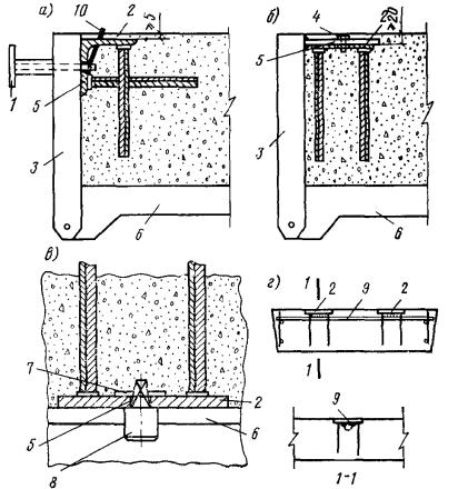 Рис. 126. Примеры фиксации закладных деталей а, б - к борту формы; в - к поддону; г - к арматуре; 1 - винтовой фиксатор; 2 - закладная деталь; 3 - борт формы; 4 - болт; 5 - отверстие для фиксации в пластине закладной детали; 6 - поддон формы; 7 - чека; 8 - шип с отверстием для чеки; 9 - соединительный стержень; 10 - шплинтующая проволока, выходящая на поверхность бетона (извлекается после уплотнения бетона). Чека - из алюминиевой проволоки диаметром 3 мм Пластины5.110. Назначение размеров пластин и их профиля должно производиться из условий обеспечения: прочности и жесткости пластин с учетом возможных эксцентрицитетов приложения нагрузок; размещения необходимого числа анкеров с учетом положения примыкающих арматурных элементов; прочности и удобства выполнения сварных соединений; размещения соединительных накладок и монтажных сварных швов; положения закладных деталей в изделии и положения изделий при монтаже с учетом допускаемых отклонений; удобства фиксации закладной детали в форме; качественной укладки бетона; применения механизированного заглаживания поверхностей железобетонного изделия. С целью унификации закладные детали и стыки следует проектировать так, чтобы размеры пластин по возможности не зависели от размеров сечений железобетонных элементов. Если размеры пластины назначаются близкими к размеру сечения железобетонного элемента, следует учитывать допускаемые плюсовые отклонения их размеров, предусмотренные нормативными документами, и обеспечить возможность свободной установки закладной детали при минусовых отклонениях размеров формы. 5.111(5.45). Толщина пластин закладных деталей определяется в соответствии с указаниями п. 3.106 и требованиями сварки (см. пп. 5.117 и 5.118). Толщина пластин сварных закладных деталей должна приниматься не менее 6 мм, толщина стенок или полок фасонного проката, к которым привариваются анкеры и соединительные детали - не менее 5 мм. Для нерасчетных соединений допускается указанные выше минимальные толщины снижать на 1 мм. Анкеры5.112(5.45). Анкеры закладных деталей следует проектировать преимущественно из арматуры классов А-II и А-III. Анкеры из стали класса А-I должны иметь на концах крюки, шайбы или высаженные головки. Нормальные анкеры могут применяться для передачи как осевых (вдоль анкера), так и боковых усилий, касательные анкеры - только осевых усилий. Кроме касательных в закладной детали должны предусматриваться также нормальные анкеры, сечение которых назначается согласно указаниям пп. 3.104 и 3.105. Для обеспечения защитного слоя бетона или возможности размещения анкера касательный анкер может иметь отгиб до 30° от оси, параллельной пластине. Допускается увеличение этого угла до 60° при обеспечении радиуса загиба анкера R не менее 10d и до 90° при радиусе загиба не менее 20d. Загиб анкера должен начинаться на расстоянии не менее 2d от ближайшего края сварного соединения анкера с пластиной (рис. 127). 5.113. При наличии прижимающего усилия (т.е. при N'ан > 0, см. п. 3.104) допускается передача сдвигающих (касательных) усилий на бетон через упоры из полосовой стали или круглых коротышей (рис. 125,в). Высоту упоров рекомендуется принимать не менее 10 и не более 40 мм. Такое решение может применяться при знакопеременных сдвигающих усилиях, если не представляется возможным разместить касательные анкеры. При размещении упоров вблизи кр