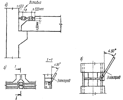 Рис. 89. Размеры крюков на концах стержней рабочей арматуры 5.12. Размеры крюков для анкеровки гладких стержней арматуры должны приниматься в соответствии с рис. 89. Сварные соединения арматуры5.13(5.32). Арматура из горячекатаной стали периодического профиля, горячекатаной гладкой стали и обыкновенной арматурной проволоки должна, как правило, изготовляться с применением для соединений стержней контактной сварки - точечной и стыковой, а также в указанных ниже случаях дуговой (ванной и протяженными швами) сварки. Типы сварных соединений арматуры должны назначаться и выполняться в соответствии с указаниями государственных стандартов и нормативных документов (см. табл. 34). Соединения, не предусмотренные государственными стандартами, допускается выполнять по рабочим чертежам, утвержденным в установленном порядке. 5.14(5.33). Контактная точечная сварка применяется при изготовлении сварных каркасов, сеток и закладных деталей с нахлесточными соединениями стержней. 5.15(5.34). Контактная стыковая сварка применяется для соединения по длине заготовок арматурных стержней. Диаметр соединяемых стержней при этом должен быть не менее 10 мм. Контактную сварку стержней диаметром менее 10 мм допускается применять только в заводских условиях при наличии специального оборудования. 5.16. Для соединения встык горизонтальных и вертикальных стержней диаметром 20 мм и более при монтаже арматуры и сборных железобетонных конструкций рекомендуется предусматривать ванную сварку в инвентарных съемных формах (поз. 3 табл. 34). Допускается в тех же условиях применение ванной сварки, ванно-шовной сварки и сварки многослойными швами с остающимися желобчатыми подкладками или накладками. 5.17. Проектирование сварных стыков арматурных стержней с применением инвентарных форм и других формующих элементов производится с учетом следующих требований: а) расстояния между стыкуемыми стержнями, а также расстояния от стыкуемых стержней до ближайшей грани железобетонного элемента должны назначаться с учетом возможности установки формующих элементов и удаления инвентарных форм. Размеры и способы установки инвентарных форм, желобчатых накладок, подкладок, а также расстояния между стыкуемыми стержнями следует принимать согласно нормативным документам по сварке. Расстояние от торцов стыкуемых выпусков до граней элементов (с учетом защиты бетона от перегрева) - не менее 120 мм (рис. 90,а); б) расположение стыкуемых стержней должно обеспечивать возможность ввода электрода под углом не более 30° к вертикали (рис. 90,б, в); в) зазоры между стыкуемыми стержнями при дуговой ванной сварке должны выполняться в соответствии с требованиями государственных стандартов и нормативных документов по сварке. При зазорах, превышающих максимально допустимые, соединение стержней допускается производить с применением промежуточного элемента - вставки из арматурного стержня того же диаметра и класса, что и стыкуемые стержни. При этом длина вставки lb принимается не менее 4d и не менее 150 мм (рис. 90,а). Рис. 90. Дуговая ванная сварка стержней а - соединение при помощи вставки; б - горизонтальный стык; в - вертикальный стык Таблица 34 Основные типы сварных соединений стержневой арматуры