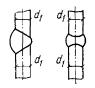 Приварка дополнительных стержней может производиться контактной сваркой с учетом требований табл. 35, 38 и рис. 95,в, а также дуговой сваркой с учетом требований п. 5.19 и рис. 91. Рис. 91. Образование сварной сетки с приваркой дополнительного продольного стержня а - исходная сетка; б - приварка дополнительного стержня к основному вплотную электродуговой сваркой продольными швами; в - приварка дополнительного стержня вблизи основного продольного стержня при помощи точечной сварки; 1 - основной стержень; 2 - дополнительный; 3 - электродуговая сварка; d1 - диаметр дополнительного стержня Таблица 37
