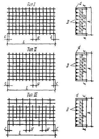 5.25. При конструировании сварных сеток следует предусматривать возможность их изготовления на многоэлектродных машинах. Справочные данные о параметрах широких сварных сеток, изготовляемых на серийно выпускаемых многоэлектродных машинах с помощью контактной точечной сварки, приводятся в табл. 36, а для узких сеток - в табл. 37. В целях сокращения числа переналадок многоэлектродных машин рекомендуется при проектировании унифицировать шаги арматуры, главным образом продольной, для железобетонных изделий данной серии или каталога. Допускается принимать отличающиеся от указанных в табл. 36 и 37 шаги стержней при разработке чертежей железобетонных изделий для конкретного завода-изготовителя применительно к параметрам установленного оборудования и при условии унификации этих шагов на заводе. Сварные сетки, изготовляемые на многоэлектродных машинах, должны иметь прямоугольный контур с прямоугольными ячейками. При необходимости получения равнопрочного соединения стержни периодического профиля (классов А-II и А-III) могут применяться только в одном направлении (продольном или поперечном). 5.26. Сварные сетки, конструктивные параметры которых не позволяют изготовлять их на многоэлектродных машинах, допускается, в виде исключения, проектировать, ориентируясь на технологические возможности одноточечных сварочных машин (табл. 38). 5.27. Товарные сварные сетки, а также сетки, изготовленные на многоэлектродных и одноточечных машинах, могут быть использованы в виде законченного арматурного изделия или как полуфабрикат, подвергаемый доработке (разрезка сетки, вырезка отверстий, гнутье для получения пространственного каркаса и в виде исключения - приварка дополнительных стержней). Таблица 36