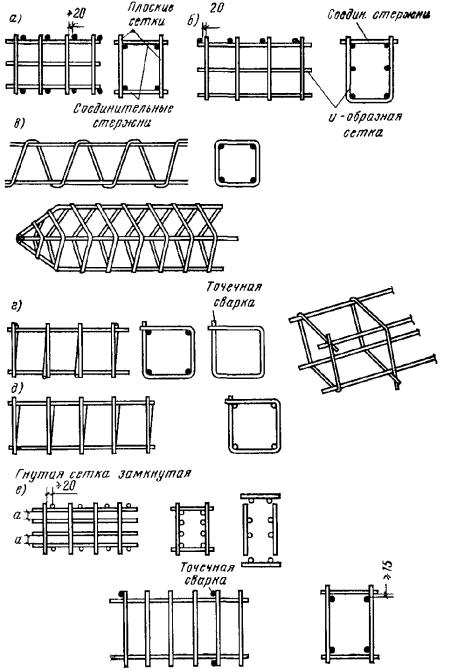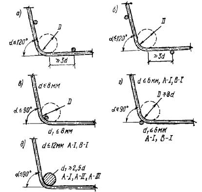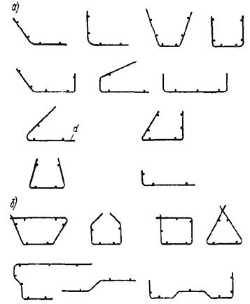 Сгибание сетки производится в соответствии с рекомендациями п. 5.31. 5.28. При армировании стенок балок переменной высоты рекомендуется: а) при уклоне не более 1:10 - применять сетки с группами стержней одной длины (рис. 92,а); б) при уклоне более 1:10 - принимать раздельные прямоугольные сетки (рис. 92,б) или прямоугольные сетки с последующей разрезкой по наклонной линии (рис. 92,в) с добавлением при необходимости окаймляющего стержня. 5.29. При армировании непрямоугольных плит рекомендуется применять сварные сетки, получаемые из прямоугольных в результате их разрезки (рис. 92,г). Рис. 92. Армирование изделий переменных размеров а - армирование стенки балки переменной высоты сеткой с группами стержней одной длины; б - то же, раздельными прямоугольными сетками; в - то же, прямоугольной сеткой с разрезкой ее по наклонной линии и добавлением окаймляющего стержня; г - сварная сетка для армирования плиты переменной ширины, получаемая разрезкой прямоугольной сетки Пространственные арматурные каркасы5.30. Арматуру железобетонных элементов следует проектировать преимущественно, а линейных элементов - в особенности, в виде пространственных каркасов. Пространственные каркасы могут выполняться целиком на изделие либо в виде изготовленных заранее пространственных блоков, применяемых в сочетании с плоскими или гнутыми сетками, отдельными стержнями и т.п. Пространственные каркасы следует конструировать достаточно жесткими для возможности их складирования, перевозки и соблюдения проектного положения в форме. Пространственная жесткость их должна обеспечиваться постановкой в необходимых случаях связей на сварке: диагональных стержней, планок и т.п. Закладные детали и строповочные устройства - петли, трубки и т.п. допускается заранее крепить к пространственному каркасу. Если требуется высокая точность положения закладных деталей, то фиксация должна осуществляться креплением их к форме. 5.31. При образовании пространственных каркасов с применением гнутья плоских сеток рекомендуется предусматривать гнутые сетки с очертанием по типу приведенных на рис. 93,а и получаемых на стандартном гибочном оборудовании. При этом должны соблюдаться следующие требования: длина сеток - не более 6 м (по согласованию с заводом-изготовителем допускается до 9 м); длина отгибаемого участка - не менее 50 мм; углы загиба α - не более 120°; диаметр изгибаемых стержней из стали класса А-I - не более 12 мм, классов А-II и А-III - не более 10 мм, Вр-I и В-I - любой. При массовом изготовлении допускаются гнутые сетки и других очертаний, например по типу приведенных на рис. 93,б, изготовление которых требует специального оборудования или приспособлений. Рис. 93. Примеры очертания гнутых сварных сеток а - рекомендуемые (изготовляются на стандартном оборудовании); б - допускаемые (требуют нестандартного оборудования или приспособлений). Расположение прямых продольных стержней показано условно Рис. 94. Параметры гнутых сварных сеток а - место загиба сетки удалено от продольных стержней, расположенных с внутренней стороны; б - то же, с наружной стороны; в - место загиба сетки совпадает с продольным стержнем, расположенным с внутренней стороны; для А-I, В-I D ≥ 4d, для А-III D ≥ 8d; г - то же, с наружной стороны; д - то же, при крупных диаметрах продольных стержней; d - диаметр гнутого стержня; D - внутренний диаметр загиба с