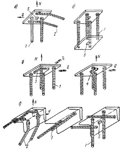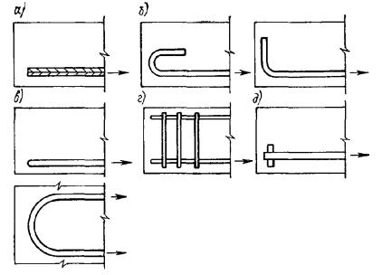 условный стержень диаметром: 5.45(5.12). Указанные в пп. 5.43 и 5.44 расстояния в свету между стержнями периодического профиля принимаются по номинальному диаметру без учета выступов и ребер. При компоновке расположения арматуры в сечении со стесненными условиями, с учетом примыкающих других арматурных элементов и закладных деталей, следует принимать во внимание диаметры стержней с учетом выступов и ребер, а также допускаемые отклонения от номинальных размеров стержней, сварных сеток и каркасов, закладных деталей, формы, расположения арматуры и закладных деталей в сечении. Рис. 99. Примеры расположения одного из рядов стержней нижней арматуры (располагаемой в один или два ряда по высоте) в случае изготовления изделия на виброплощадке а, б, в - варианты расположения стержней диаметром 32 мм; г, д, е - то же, 16 мм; а, г - одиночные расположения стержней; б, д - спаренное расположение с уменьшенным расстоянием между парой стержней; в, е - то же, с расположением пар стержней вплотную. Пунктиром показаны условные стержни, эквивалентные паре сближенных стержней Анкеровка арматуры5.46. При проектировании железобетонных конструкций необходимо обеспечить надежную анкеровку арматуры в бетоне, препятствующую их взаимному смещению. Анкеровка арматуры может осуществляться одним из следующих способов или их сочетанием (рис. 100): сцеплением прямых стержней с бетоном; крюками или лапками; петлями; приваркой поперечных стержней; особыми приспособлениями (анкерами). 5.47(5.13). Стержни периодического профиля, а также гладкие арматурные стержни, применяемые в сварных каркасах и сетках, выполняются без крюков. Растянутые гладкие стержни вязаных каркасов и вязаных сеток должны заканчиваться полукруглыми крюками (рис. 89), лапками или петлями. 5.48(5.14). Продольные стержни растянутой и сжатой арматуры должны быть заведены за нормальное к продольной оси элемента сечение, в котором они учитываются с полным расчетным сопротивлением, на длину не менее lан, определяемую по формуле но не менее lан = λанd, где значения mан, ∆λан и λан, а также допускаемые минимальные величины lан определяются по табл. 40. При этом гладкие арматурные стержни должны оканчиваться крюками, выполняемыми согласно п. 5.12, или иметь приваренную поперечную арматуру по длине заделки. Рис. 100. Анкеровка арматуры а - сцеплением прямых стержней с бетоном; б - крюками и лапками; в - петлями; г - приваркой поперечных стержней; д - особыми приспособлениями (анкерами). Таблица 40(39)