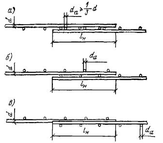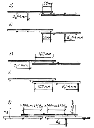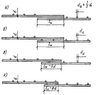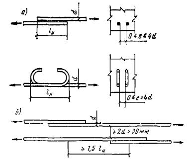 В каждой из стыкуемых в растянутой зоне сварных сеток с рабочими стержнями из гладкой стали на длине нахлестки должно быть не менее двух поперечных стержней, приваренных ко всем продольным стержням сетки (рис. 106). Диаметр поперечных анкерующих стержней должен быть не менее одной трети диаметра продольного анкеруемого стержня и не менее величин, указанных в п. 5.22. Длина нахлестки сварных сеток с гладкой рабочей арматурой при наличии двух приваренных анкерующих стержней по длине нахлестки должна быть не менее величины lн, определенной по указаниям п. 5.52. Такие же типы стыков применяются и для стыкования внахлестку сварных сеток и каркасов с односторонним расположением рабочих стержней из всех видов стали. Стыки сварных сеток в направлении рабочей арматуры периодического профиля классов А-II и А-III выполняются без поперечных стержней в пределах стыка в одной или в обеих стыкуемых сетках (рис. 107,а, б), при этом длина нахлестки принимается в соответствии с требованиями п. 5.52. При приварке поперечных анкерующих стержней к рабочим стержням периодического профиля сварных сеток и каркасов длина нахлестки, определенная по указаниям п. 5.52, может быть уменьшена: на 5d - при одном поперечном анкерующем стержне; на 8d - при двух поперечных анкерующих стержнях. Во всех случаях длина нахлестки должна быть не менее 15d в растянутом и 10d - в сжатом бетоне. Если диаметр рабочих