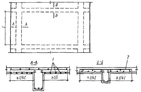 Величины предельно допустимых прогибов приведены в табл. 2. Расчет прогибов должен производиться: при ограничении технологическими или конструктивными требованиями - на действие постоянных, длительных и кратковременных нагрузок; при ограничении эстетическими требованиями - на действие постоянных и длительных нагрузок. При этом коэффициент перегрузки n принимается равным единице. Для не защищенных от солнечной радиации конструкций, предназначенных для эксплуатации в климатическом подрайоне IVA, согласно главе СНиП по строительной климатологии и геофизике, при определении перемещений необходимо учитывать температурные климатические воздействия. Для железобетонных элементов, выполняемых со строительным подъемом, значения предельно допустимых прогибов могут быть увеличены на высоту строительного подъема, если это не ограничивается технологическими или конструктивными требованиями. Величины предельно допустимых прогибов в других случаях (не предусмотренных табл. 2) устанавливаются по специальным требованиям, но при этом они не должны превышать 1/150 пролета и 1/75 вылета консоли. Если в нижележащем помещении с гладким потолкам имеются расположенные поперек пролета элемента l постоянные перегородки (не являющиеся опорами) с расстоянием между ними lп, то прогиб элемента в пределах расстояний lп (отсчитываемый от линии, соединяющей верхние точки осей перегородок) может быть допущен до 1/200lп, однако при этом предельный прогиб всего элемента должен быть не более 1/150l. 1.20(1.21). Для не связанных с соседними элементами железобетонных плит перекрытий, лестничных маршей, площадок и т.п. должна производиться дополнительная проверка по зыбкости: дополнительный прогиб от кратковременно действующей сосредоточенной нагрузки 100 кгс при наиболее невыгодной схеме ее приложения должен быть не более 0,7 мм. 1.21(1.23). Расстояния между температурно-усадочными швами должны устанавливаться расчетом. Расчет допускается не производить при расчетных зимних температурах наружного воздуха выше минус 40 °С, если принятые расстояния между температурно-усадочными швами не превышают величин, приведенных в табл. 3. 1.22. При расчете перекрытия по предельным состояниям второй группы вес перегородок учитывается следующим образом: а) нагрузка от веса жестких перегородок (например, железобетонных сборных, выполняемых из горизонтальных элементов, железобетонных и бетонных, монолитных, каменных и т.п.) принимается сосредоточенной по концам перегородки, а при наличии проемов - и у краев проема; б) для прочих перегородок - 60 % их веса принимаются распределенными по длине перегородки (на участках между проемами), а 40 % - сосредоточенными по концам перегородки и у краев проема. 1.23. Распределение местной нагрузки между элементами сборных перекрытий, выполняемых из многопустотных или сплошных плит, при условии обеспечения качественной заливки швов между плитами, допускается производить с учетом нижеследующих указаний: Таблица 3(3)