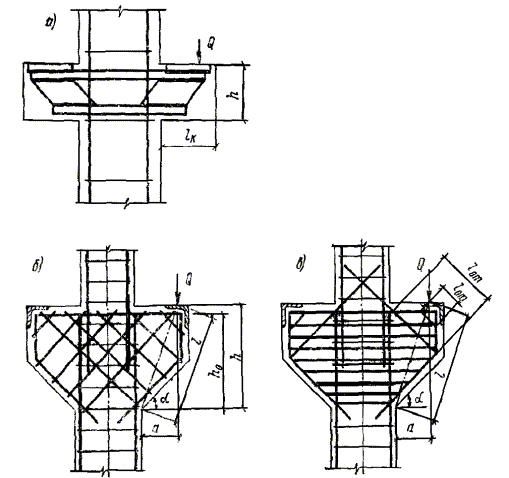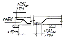 Величины относительной длины анкеровки λан = lан/d, вычисленные по формуле (308) для разных марок бетона и для разных классов арматуры, приведены в табл. 41. В случае когда анкеруемые стержни поставлены с запасом по площади сечения против требуемой расчетом по прочности, при определении lан по формуле (308) значения Rа должны умножаться на величину, равную отношению необходимой по расчету и фактической площади сечения арматуры. Если вдоль анкеруемых стержней образуются трещины от растяжения бетона, то стержни должны быть заделаны в сжатую зону бетона на длину lан, определяемую согласно вышеуказанному. При этом высоту сжатой зоны допускается определять согласно п. 4.16. 5.49. При невозможности выполнения требований п. 5.48 должны быть приняты специальные меры по анкеровке продольных стержней: а) устройство на концах