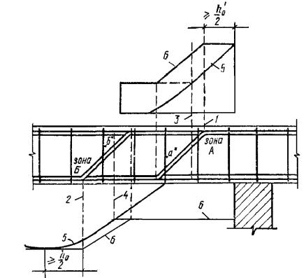 Кроме того, следует учитывать конструктивные требования п. 5.73. Расчет элементов с отогнутыми стержнями3.39. Проверка прочности по поперечной силе производился для невыгоднейших наклонных сечений, начинающихся у опоры и у начала отогнутых стержней (рис. 14), из условия Q ≤ Qх.б + Rа.хFоsinα, (60) где Q - поперечная сила в нормальном сечении у начала рассматриваемого сечения (у опоры и у начала отгибов); Fо - площадь сечения отогнутых стержней в ближайшей за началом рассматриваемого наклонного сечения плоскости отгиба; α - угол наклона плоскости отогнутых стержней к оси элемента; Qх.б - см. п. 3.35. При наличии фиксированных сосредоточенных или равномерно распределенных нагрузок допускается учитывать указания п. 3.37. Рис. 14. Места расположения невыгоднейших наклонных сечений при расчете по поперечной силе для элементов с отогнутыми стержнями 1, 2 и 3 - невыгоднейшие наклонные сечения 3.40. Необходимое сечение отогнутых стержней, расположенных в одной плоскости, определяется из условия