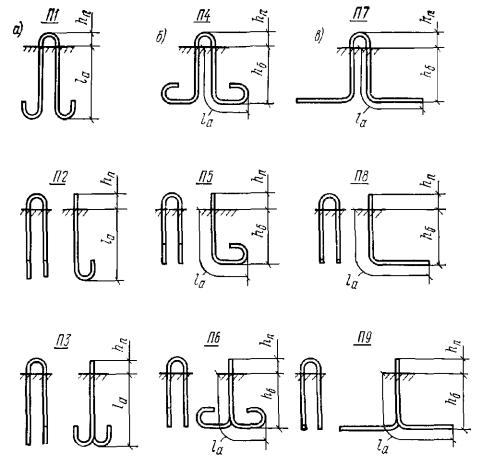 5.101. Диаметр стержня петли d следует принимать согласно табл. 46 в зависимости от приходящегося на петлю нормативного усилия. 5.102. Высоту проушины петли hп, соответствующую размерам чалочных крюков грузовых стропов, следует принимать равной: 60 мм + d при диаметре стержня петли от 6 до 18 мм; 80 мм + d » » » » 20 и 22 мм; 150 мм + d » » » » от 25 до 32 мм. Длину lа и глубину запуска hб концов ветвей петли в бетон изделия рекомендуется принимать согласно табл. 47. Допускается уменьшать длину